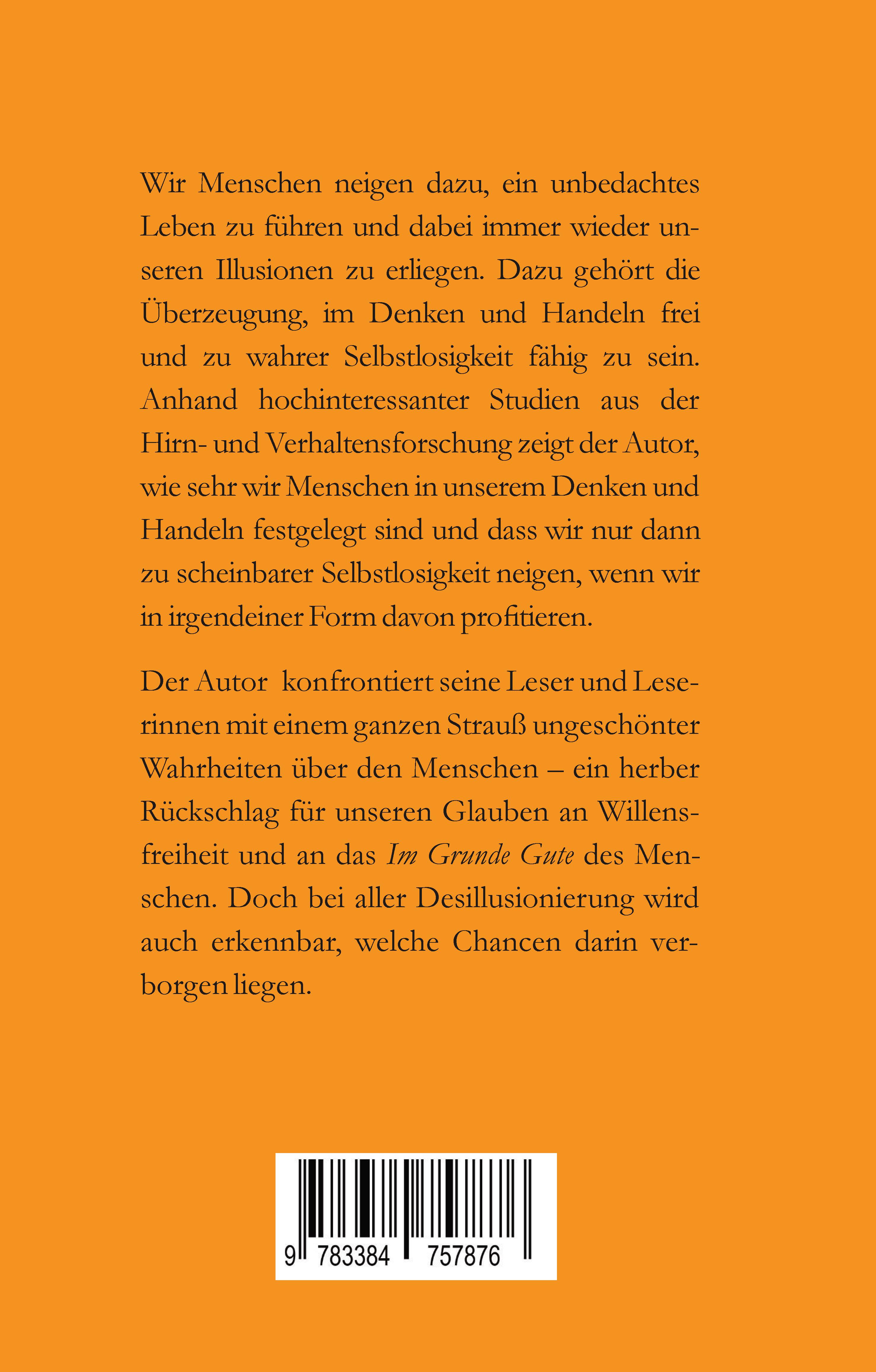 Wir Menschen neigen dazu, ein unbedachtes Leben zu führen und dabei immer wieder unseren Illusionen zu erliegen. Dazu gehört die Überzeugung, im Denken und Handeln frei und zu wahrer Selbstlosigkeit fähig zu sein. Anhand hochinteressanter Studien aus der Hirn- und Verhaltensforschung zeigt der Autor, wie sehr wir Menschen in unserem Denken und Handeln festgelegt sind und dass wir nur dann zu scheinbarer Selbstlosigkeit neigen, wenn wir in irgendeiner Form davon profitieren. Der Autor konfrontiert seine Leser und Leserinnen mit einem ganzen Strauß ungeschönter Wahrheiten über den Menschen - ein herber Rückschlag für unseren Glauben an Willensfreiheit und an das Im Grunde Gute des Menschen. Doch bei aller Desillusionierung wird auch erkennbar, welche Chancen darin verborgen liegen.