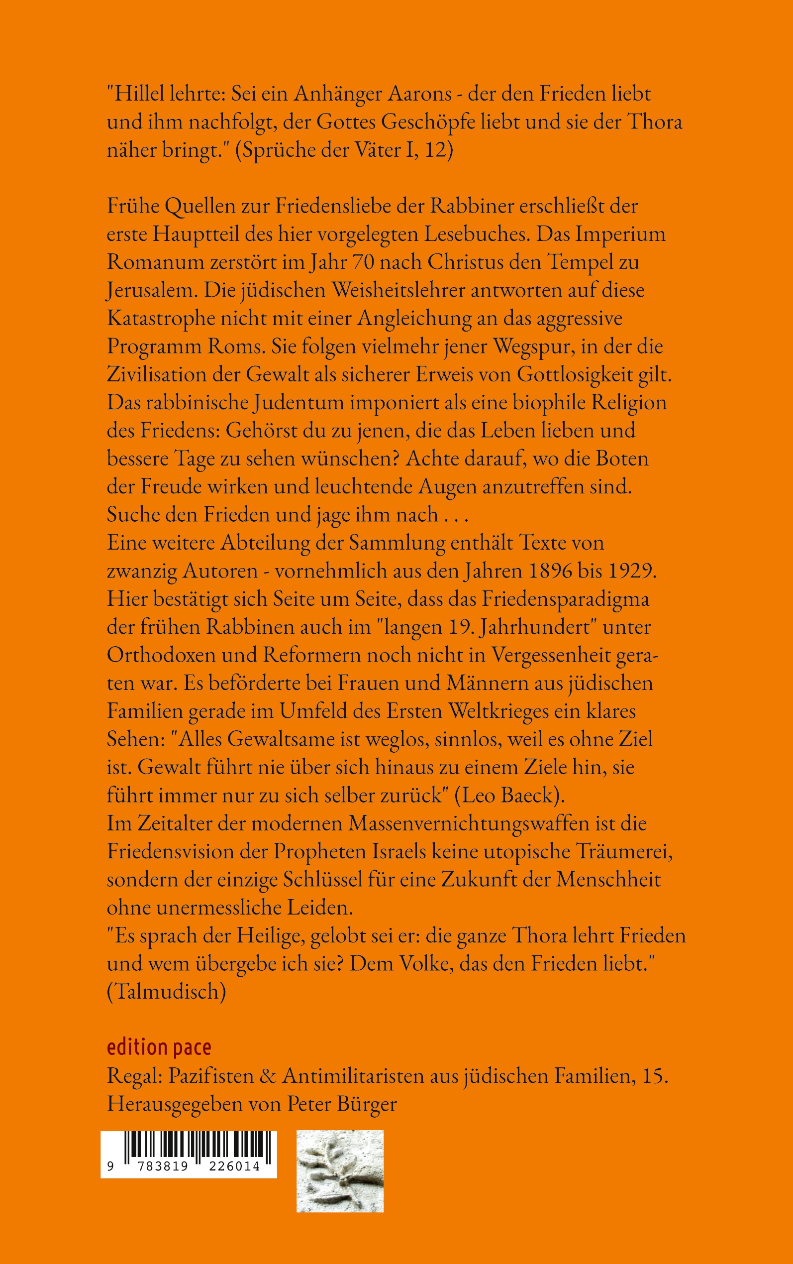 Frühe Quellen zur Friedensliebe der Rabbiner erschließt der erste Hauptteil des hier vorgelegten Lesebuches. Das Imperium Romanum zerstört im Jahr 70 nach Christus den Tempel zu Jerusalem. Die jüdischen Weisheitslehrer antworten auf diese Katastrophe nicht mit einer Angleichung an das aggressive Programm Roms. Sie folgen vielmehr jener Wegspur, in der die Zivilisation der Gewalt als sicherer Erweis von Gottlosigkeit gilt. Das rabbinische Judentum imponiert als eine biophile Religion des Friedens: Gehörst du zu jenen, die das Leben lieben und bessere Tage zu sehen wünschen? Achte darauf, wo die Boten der Freude wirken und leuchtende Augen anzutreffen sind. Suche den Frieden und jage ihm nach . . .