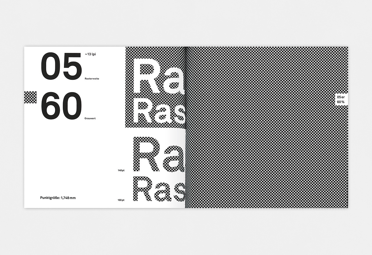 Sie können den Rasterblock wie ein Buch nutzen, Sie können die einzelnen Blätter aber auch einfach heraustrennen und testen, bei welchem Betrachtungsabstand welches Raster zur Fläche wird und welche Punkte zum Hingucker. Das empfehlen wir, wenn Sie mit der Sichtbarkeit von Rastern bei Großflächengestaltungen bewusst spielen wollen. Denn selbst mit noch so viel Erfahrung, verschätzt man sich da schnell. Wenn Ihnen der Rasterblock zum Abreißen zu schade ist, hilft der Kopierer.