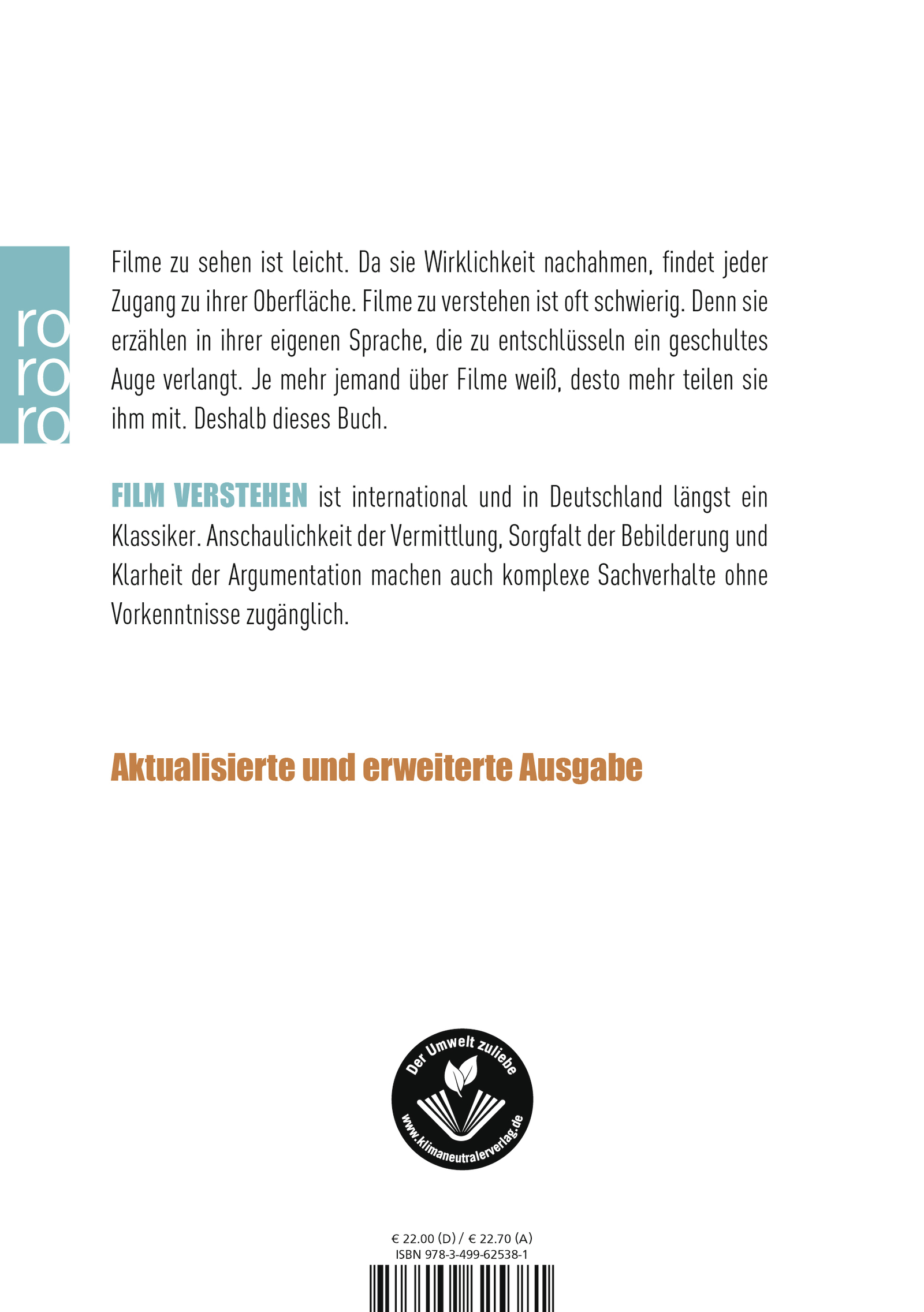 «Film verstehen» ist international und in Deutschland längst ein Klassiker. Die Anschaulichkeit der Vermittlung, die Sorgfalt der Bebilderung und die Klarheit der Argumentation machen auch komplexe Sachverhalte ohne Vorkenntnisse zugänglich.