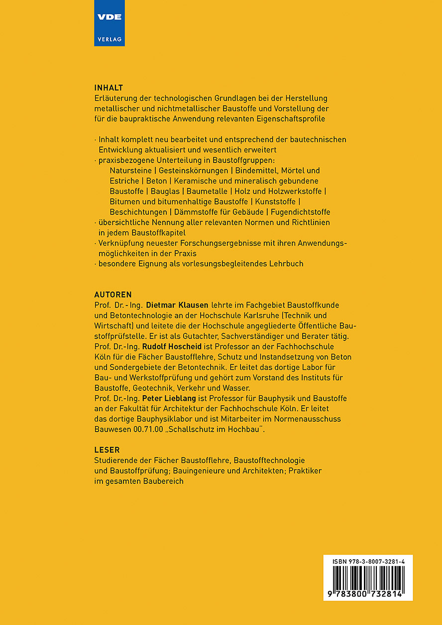 Das bekannte Autorenteam Prof. Dr.-Ing. Dietmar Klausen, Prof. Dr.-Ing. Rudolf Hoscheid und Prof. Dr.-Ing. Peter Lieblang verfügt über umfangreiches Fachwissen und Fachkompetenz in den Bereichen Baustoffkunde und Baustofflehre sowie in der Baustoffprüfung und -technologie.