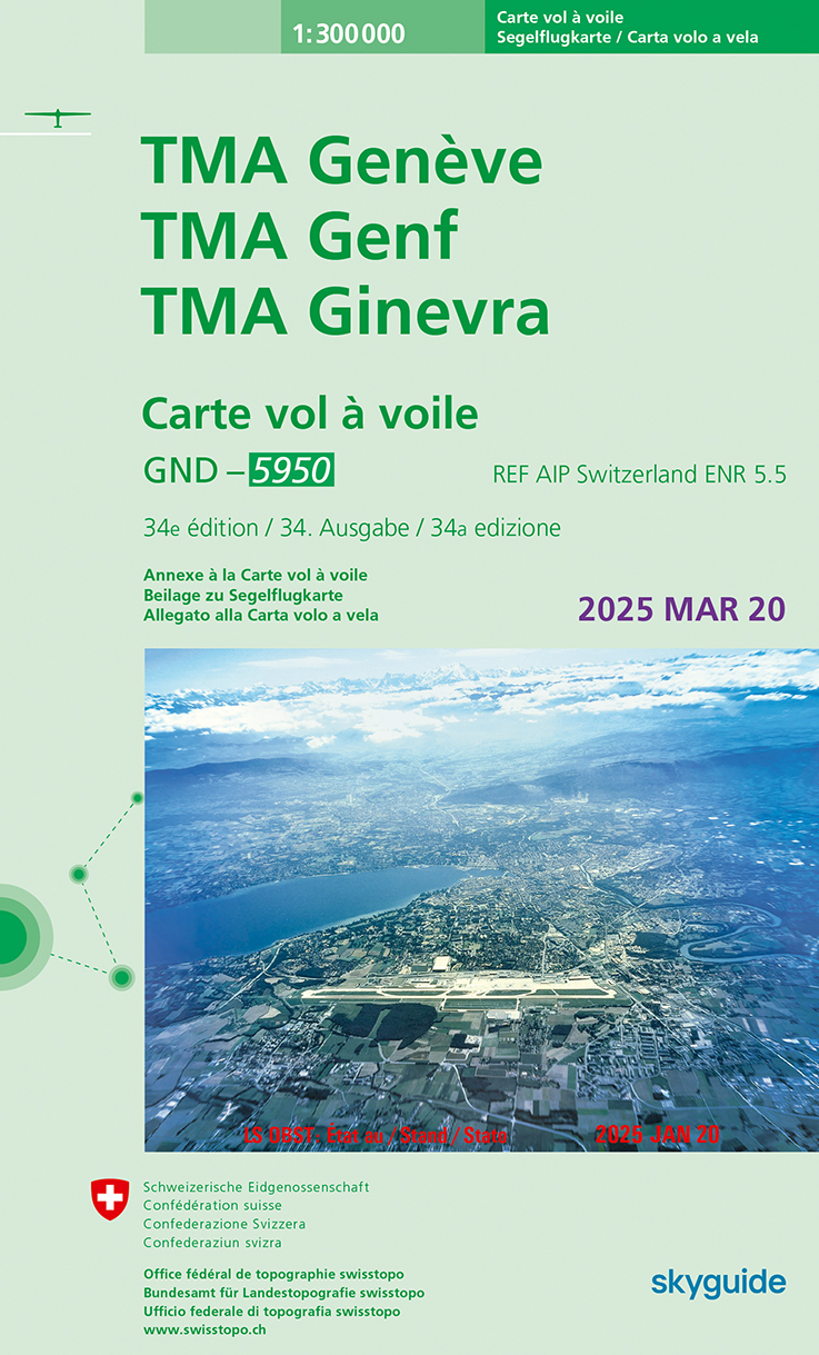 34a edizione / 2025 MAR 20 The aeronautical chart for Switzerland with air traffic control information especially for glider pilots. This general map includes airports and airfields, classified air space, restricted and hazardous areas as well as other useful information for glider pilots. An additional map contains the section for the airspace of Geneva (TMA Genève). The map is revised annually by skyguide and swisstopo.