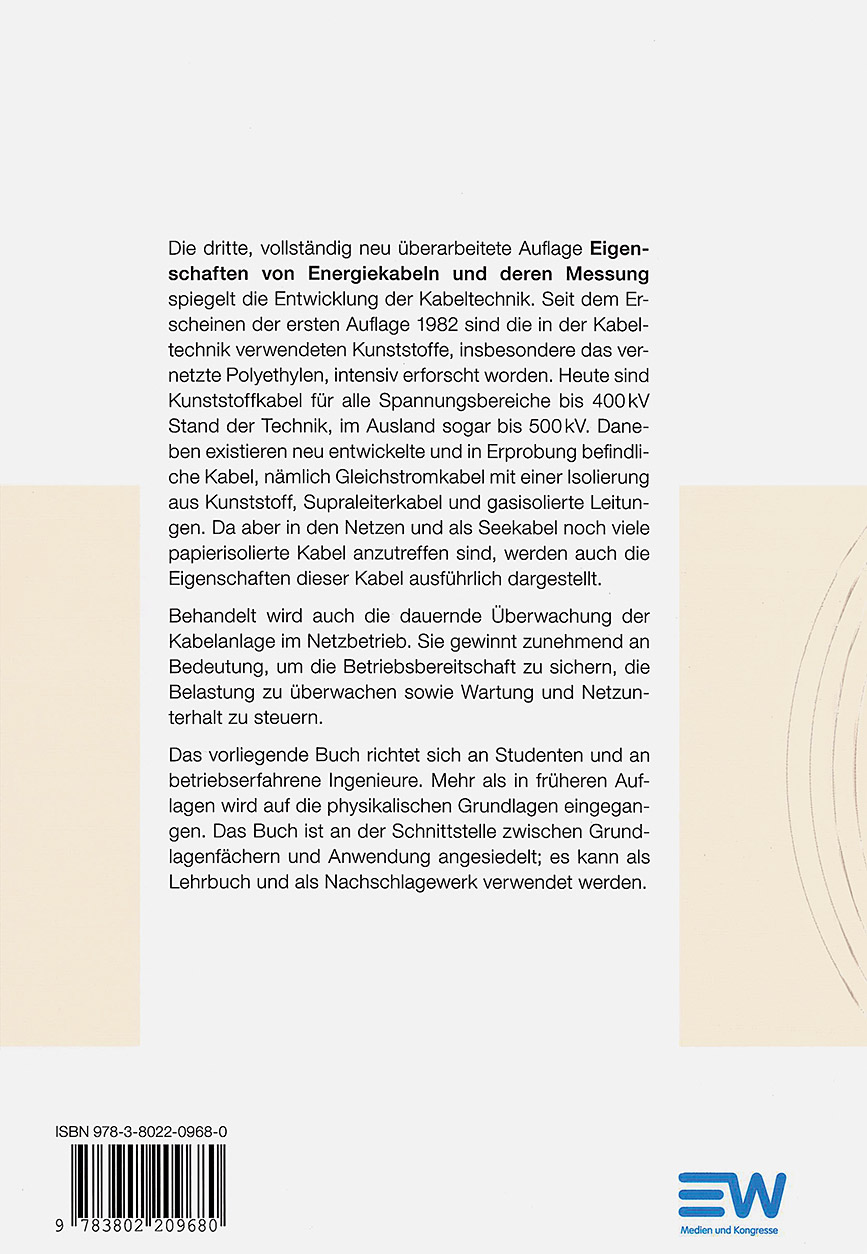 Die dritte, vollständig neu überarbeitete Auflage spiegelt die Entwicklung der Kabeltechnik. Seit dem Erscheinen der ersten Auflage 1982 sind die in der Kabeltechnik verwendeten Kunststoffe, insbesondere das vernetzte Polyethylen, intensiv erforscht worden. Heute sind Kunststoffkabel für alle Spannungsbereiche bis 400kV Stand der Technik, im Ausland sogar bis 500 kV. Daneben existieren neu entwickelte und in Erprobung befindliche Kabel, nämlich Gleichstromkabel mit einer Isolierung aus Kunststoff, Supraleiterkabel und gasisolierte Leitungen. Da aber in den Netzen und als Seekabel noch viele Papierisolierte Kabel anzutreffen sind, werden auch die Eigenschaften dieser Kabel ausführlich dargestellt.