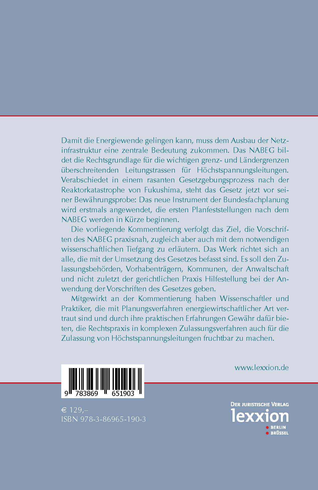 Der neue Kommentar zum NABEG erläutert die Vorschriften umfassend und stellt die erforderlichen Verknüpfungen zu anderen Regelungen zum Netzausbau her. Sein Anliegen ist es vor allem, die praktische Handhabung der neuen Vorschriften zu erleichtern. Er wendet sich an Vorhabenträger, Behörden und Gemeinden, Betroffene, Anwälte und die Justiz.