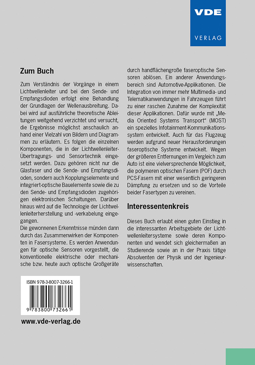 Zum Verständnis der Vorgänge in einem Lichtwellenleiter und bei den Sende- und Empfangsdioden erfolgt eine Behandlung der Grundlagen der Wellenausbreitung. Dabei wird auf ausführliche theoretische Ableitungen weitgehend verzichtet und versucht, die Ergebnisse möglichst anschaulich anhand einer Vielzahl von Bildern und Diagrammen zu erläutern. Es folgen die einzelnen Komponenten, die in der Lichtwellenleiter-Übertragungs- und Sensortechnik eingesetzt werden. Dazu gehören nicht nur die Glasfaser und die Sende- und Empfangsdioden, sondern auch Kopplungselemente und integriert-optische Bauelemente sowie die zu den Sende- und Empfangsdioden zugehörigen elektronischen Schaltungen. Darüber hinaus wird auf die Technologie der Lichtwellenleiterherstellung und -verkabelung eingegangen.Die gewonnenen Erkenntnisse münden dann durch das Zusammenwirken der Komponenten in Fasersysteme. Es werden Anwendungen für optische Sensoren vorgestellt, die konventionelle elektrische oder mechanische bzw. heute auch optische Großgeräte durch handflächengroße faseroptische Sensoren ablösen. Ein anderer Anwendungsbereich sind Automotive-Applikationen. Die Integration von immer mehr Multimedia- und Telematikanwendungen in Fahrzeugen führt zu einer raschen Zunahme der Komplexität dieser Applikationen. Dafür wurde mit "Media Oriented Systems Transport" (MOST) ein spezielles Infotainment-Kommunikationssystem entwickelt. Auch für das Flugzeug werden aufgrund neuer Herausforderungen faseroptische Systeme entwickelt. Wegen der größeren Entfernungen im Vergleich zum Auto ist eine vielversprechende Möglichkeit, die polymeren optischen Fasern (POF) durch PCS-Fasern mit einer wesentlich geringeren Dämpfung zu ersetzen und so die Vorteile beider Fasertypen zu vereinen.