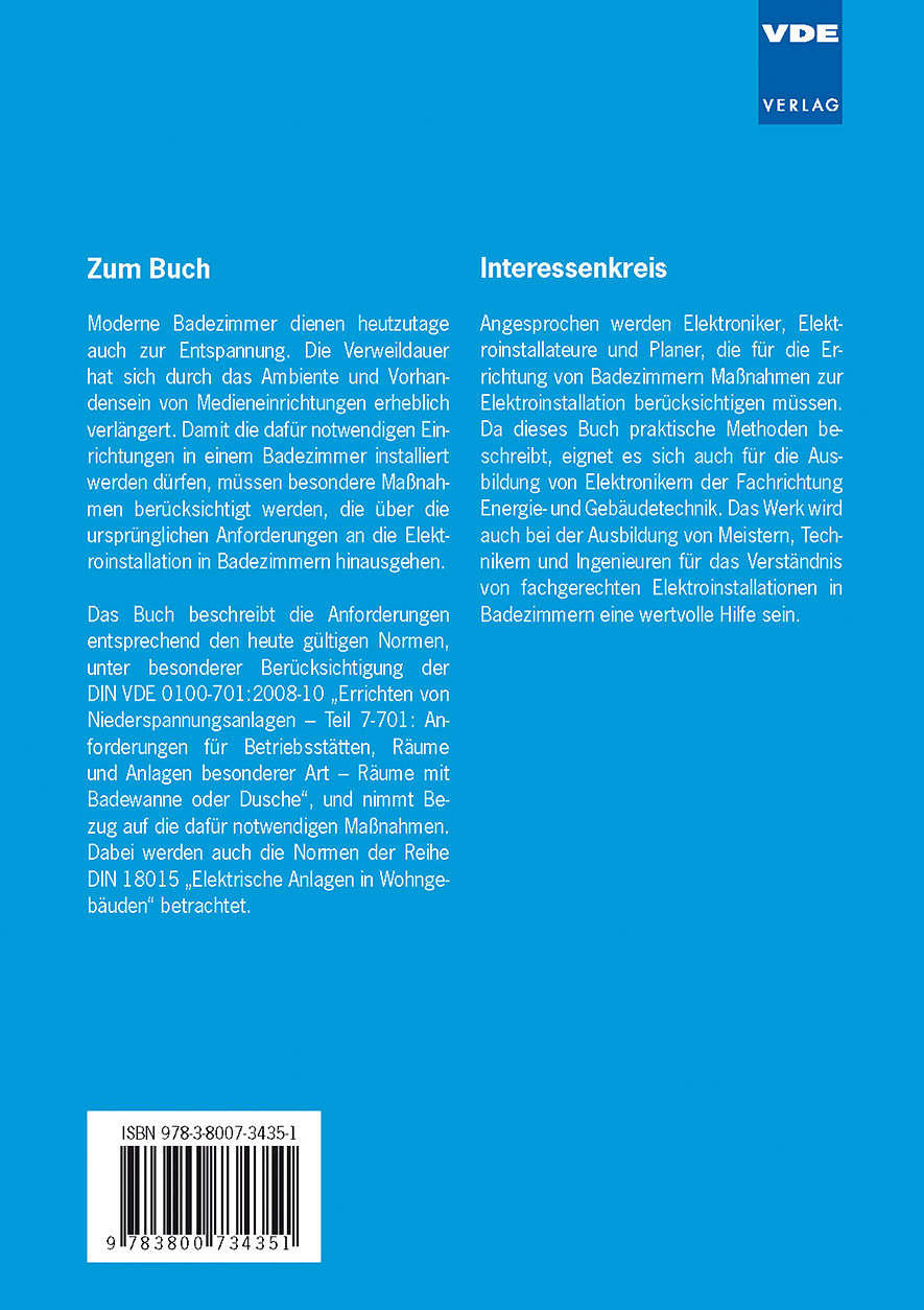 Moderne Badezimmer dienen heutzutage auch zur Entspannung. Die Verweildauer hat sich durch das Ambiente und Vorhandensein von Medieneinrichtungen erheblich verlängert. Damit die dafür notwendigen Einrichtungen in einem Badezimmer installiert werden dürfen, müssen besondere Maßnahmen berücksichtigt werden, die über die ursprünglichen Anforderungen an die Elektroinstallation in Badezimmern hinausgehen. Das Buch beschreibt die Anforderungen entsprechend den heute gültigen Normen, unter besonderer Berücksichtigung der DIN VDE 0100-701:2008-10 "Errichten von Niederspannungsanlagen - Teil 7-701: Anforderungen für Betriebsstätten, Räume und Anlagen besonderer Art - Räume mit Badewanne oder Dusche", und nimmt Bezug auf die dafür notwendigen Maßnahmen. Dabei werden auch die Normen der Reihe DIN 18015 "Elektrische Anlagen in Wohngebäuden" betrachtet.