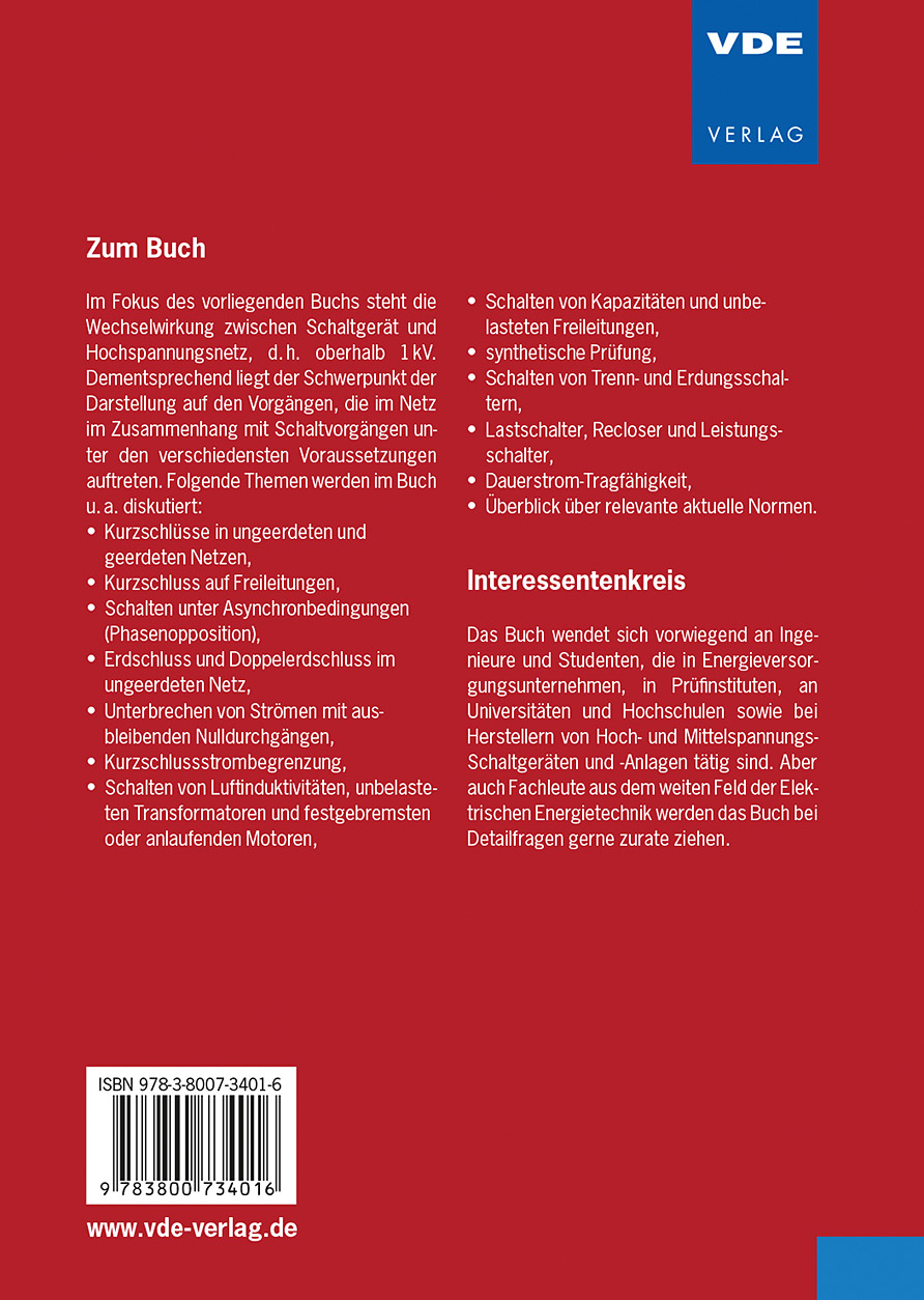 Im Fokus des vorliegenden Buchs steht die Wechselwirkung zwischen Schaltgerät und Hochspannungsnetz, d. h. oberhalb 1 kV. Dementsprechend liegt der Schwerpunkt der Darstellung auf den Vorgängen, die im Netz im Zusammenhang mit Schaltvorgängen unter den verschiedensten Voraussetzungen auftreten.Folgende Themen werden im Buch u. a. diskutiert:- Kurzschlüsse in ungeerdeten und geerdeten Netzen,- Kurzschluss auf Freileitungen,- Schalten unter Asynchronbedingungen (Phasenopposition),- Erdschluss und Doppelerdschluss im ungeerdeten Netz,- Unterbrechen von Strömen mit ausbleibenden Nulldurchgängen,- Kurzschlussstrombegrenzung,- Schalten von Luftinduktivitäten, unbelasteten Transformatoren und festgebremsten oder anlaufenden Motoren,- Schalten von Kapazitäten und unbelasteten Freileitungen,- synthetische Prüfung,- Schalten von Trenn- und Erdungsschaltern,- Lastschalter, Recloser und Leistungsschalter,- Dauerstrom-Tragfähigkeit,- Überblick über relevante aktuelle Normen.