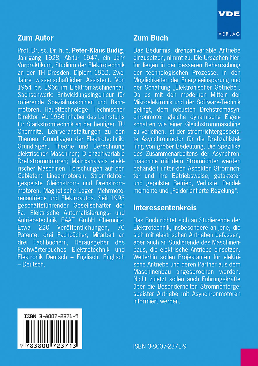 Prof. Dr. sc. Dr. h. c. Peter-Klaus Budig, Jahrgang 1928, Abitur 1947, ein Jahr Vorpraktikum, Studium der Elektrotechnik an der TH Dresden, Diplom 1952. Zwei Jahre wissenschaftlicher Assistent. Von 1954 bis 1966 im Elektromaschinenbau Sachsenwerk: Entwicklungsingenieur für rotierende Spezialmaschinen und Bahnmotoren, Haupttechnologe, Technischer Direktor. Ab 1966 Inhaber des Lehrstuhls für Starkstromtechnik an der heutigen TU Chemnitz. Seit 1993 geschäftsführender Gesellschafter der Fa. Elektrische Automatisierungs- und Antriebstechnik EAAT GmbH Chemnitz. Etwa 220 Veröffentlichungen, 70 Patente, drei Fachbücher.