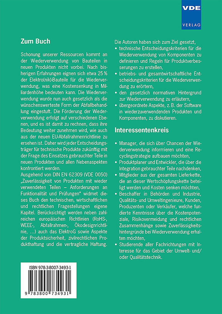 Prof. Dr.-Ing. Fevzi Belli vertritt das Fachgebiet Angewandte Datentechnik, im In stitut für Elektrotechnik und Informationsverarbeitung an der Universität Paderborn. Er war Obmann der internationalen Arbeitsgruppe zur Erstellung der IEC 62309. Dr. Ferdinand Quella leitete das Referat Produktbezogener Umweltschutz der Siemens AG in München. Er ist Initiator dieser Norm und fungierte bei der DKEArbeitsgruppe als stellvertretender Obmann. Dr. Jan Bohnstedt ist Partner einer Rechtsanwaltsgesellschaft in Frankfurt am Main mit Schwerpunkt im Technikrecht (Vertriebsrecht, Produkthaftung etc.). Neben seiner Anwaltstätigkeit ist er als Dozent an der Universität Paderborn und beim VDE tätig.