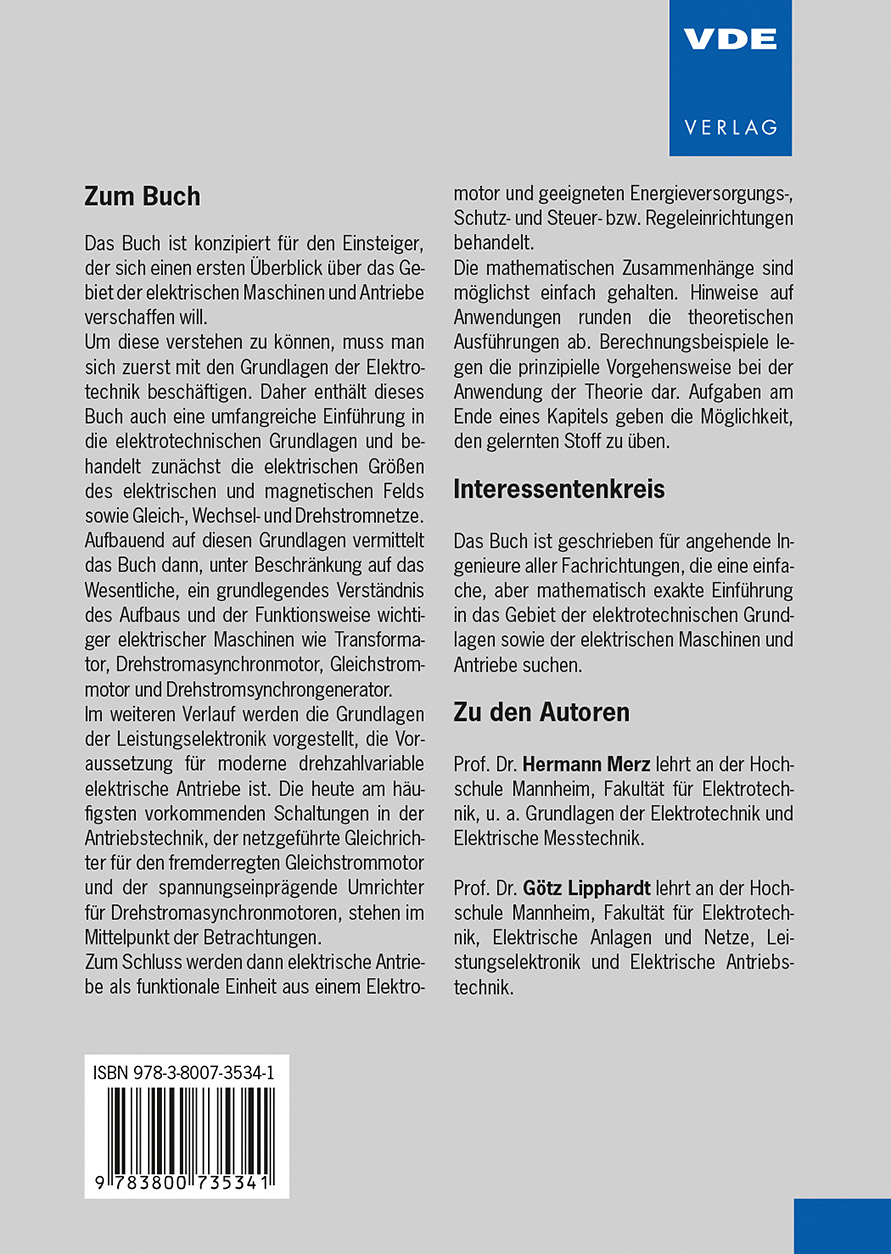 Das Buch ist konzipiert für den Einsteiger, der sich einen ersten Überblick über das Gebiet der elektrischen Maschinen und Antriebe verschaffen will.Um diese verstehen zu können, muss man sich zuerst mit den Grundlagen der Elektrotechnik beschäftigen. Daher enthält dieses Buch auch eine umfangreiche Einführung in die elektrotechnischen Grundlagen und behandelt zunächst die elektrischen Größen des elektrischen und magnetischen Felds sowie Gleich-, Wechsel- und Drehstromnetze.Aufbauend auf diesen Grundlagen vermittelt das Buch dann, unter Beschränkung auf das Wesentliche, ein grundlegendes Verständnis des Aufbaus und der Funktionsweise wichtiger elektrischer Maschinen wie Transformator, Drehstromasynchronmotor, Gleichstrommotor und Drehstromsynchrongenerator.Im weiteren Verlauf werden die Grundlagen der Leistungselektronik vorgestellt, die Voraussetzung für moderne drehzahlvariable elektrische Antriebe ist. Die heute am häufigsten vorkommenden Schaltungen in der Antriebstechnik, der netzgeführte Gleichrichter für den fremderregten Gleichstrommotor und der spannungseinprägende Umrichter für Drehstromasynchronmotoren, stehen im Mittelpunkt der Betrachtungen.Zum Schluss werden dann elektrische Antriebe als funktionale Einheit aus einem Elektromotor und geeigneten Energieversorgungs-, Schutz- und Steuer- bzw. Regeleinrichtungen behandelt.Die mathematischen Zusammenhänge sind möglichst einfach gehalten. Hinweise auf Anwendungen runden die theoretischen Ausführungen ab. Berechnungsbeispiele legen die prinzipielle Vorgehensweise bei der Anwendung der Theorie dar. Aufgaben am Ende eines Kapitels geben die Möglichkeit, den gelernten Stoff zu üben.
