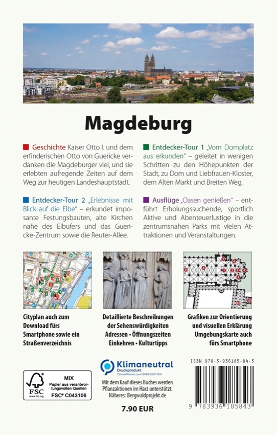 Den Magdeburg-Band haben wir mit dieser Auflage in unser neues moderneres Layout überführt, auf FSC-zertifiziertem Material gedruckt und vollständig klimaneutral produziert. Den CO2-Ausgleich vollziehen wir über die Unterstützung mehrerer Baumpflanzprojekte im Harz. Ein Kapitel "Dommuseum Ottonianum" ergänzt jetzt den Reiseführer. Für die neue Auflage haben wir etliche Fotos erneuert sowie in Gesprächen mit Historikern, Museumsleitern und Einheimischen weitere aktuelle Veränderungen aufgespürt und in den Texten verarbeitet.