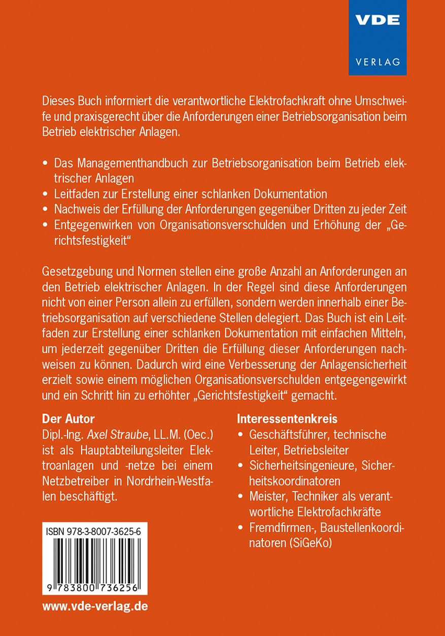 Dieses Buch informiert die verantwortliche Elektrofachkraft ohne Umschweife und praxisgerecht über die Anforderungen einer Betriebsorganisation beim Betrieb elektrischer Anlagen.- Das Managementhandbuch zur Betriebsorganisation beim Betrieb elektrischer Anlagen- Leitfaden zur Erstellung einer schlanken Dokumentation- Nachweis der Erfüllung der Anforderungen gegenüber Dritten zu jeder Zeit- Entgegenwirken von Organisationsverschulden und Erhöhung der "Gerichtsfestigkeit"Gesetzgebung und Normen stellen eine große Anzahl an Anforderungen an den Betrieb elektrischer Anlagen. In der Regel sind diese Anforderungen nicht von einer Person allein zu erfüllen, sondern werden innerhalb einer Betriebsorganisation auf verschiedene Stellen delegiert. Das Buch ist ein Leitfaden zur Erstellung einer schlanken Dokumentation mit einfachen Mitteln, um jederzeit gegenüber Dritten die Erfüllung dieser Anforderungen nachweisen zu können. Dadurch wird eine Verbesserung der Anlagensicherheit erzielt sowie einem möglichen Organisationsverschulden entgegengewirkt und ein Schritt hin zu erhöhter "Gerichtsfestigkeit" gemacht.
