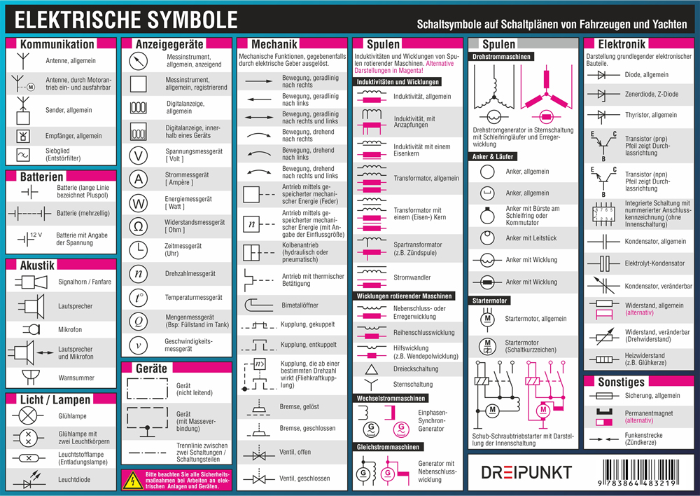 Wer eine Yacht oder ein Auto hat und selbst etwas an der Elektrik reparieren oder zusätzlich einbauen möchte, hat sie schon einmal gesehen: Schaltpläne! Für den Laien unübersichtlich, enthalten sie alle wichtigen Angaben zur elektrischen Anlage. Jede Leitung, jeder Verbraucher und jeder Schaltmöglichkeit ist mit Hilfe von Symbolen dargestellt. Mit Hilfe dieser zweiseitigen Info-Tafel können auch Sie die komplexen Schaltpläne lesen lernen! Optimal einzusetzen in Schule, Ausbildung und Beruf sowie bei allgemeinem Interesse und natürlich zum Auffrischen nach längerer 'Elektro-Abstinenz'!