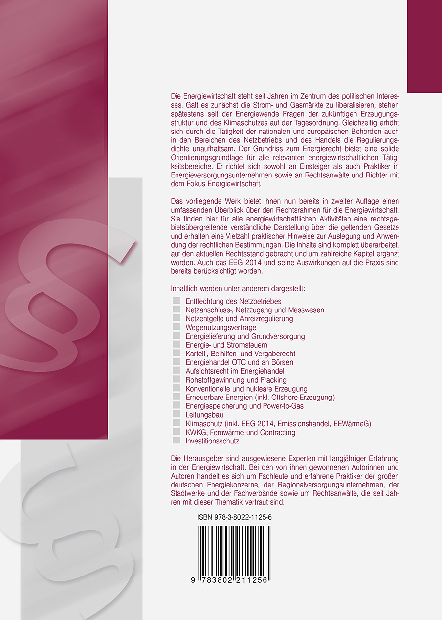 | Schlagworte | Energiedienstleistung • Energiedienstleistungen • Energierecht • Energierecht (EnergieR) • Energierecht, Netzbetrieb, Handel, Vertrieb, Erzeugung, Energiedienstleistungen, Investitionsschutz, Netzanschluss, Netzzugang, Netzentgelte, Messwesen, Wegenutzungsverträge, Regulierungsbehörde, Unlauterkeitsrecht, Energie-und Stromsteuer, Kartellrecht, H • Energiewirtschaft • Erneuerbare Energie • Erneuerbare Energien • Handel • Investitionsschutz • konventionelle Erzeugung • Leitungsbau • Netzbetrieb • Vertrieb • Wegenutzung |