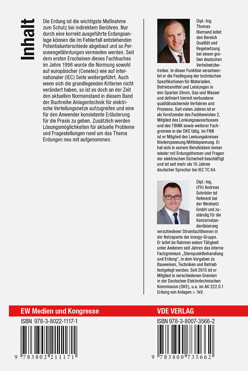Dipl.-Ing. Thomas Niemand leitet den Bereich Qualität und Regelsetzung bei einem großen deutschen Verteilnetzbetreiber. Er ist in zahlreichen nationalen und internationalen Gremien und Ausschüssen tätig. Dipl.-Ing. (FH) Andreas Schröder ist Referent bei der Westnetz GmbH und zuständig für die Konzernstandardisierung verschiedener Stromfachthemen in der Netzsparte der RWE-Gruppe. Er ist Mitglied in verschiedenen Gremien der DKE.