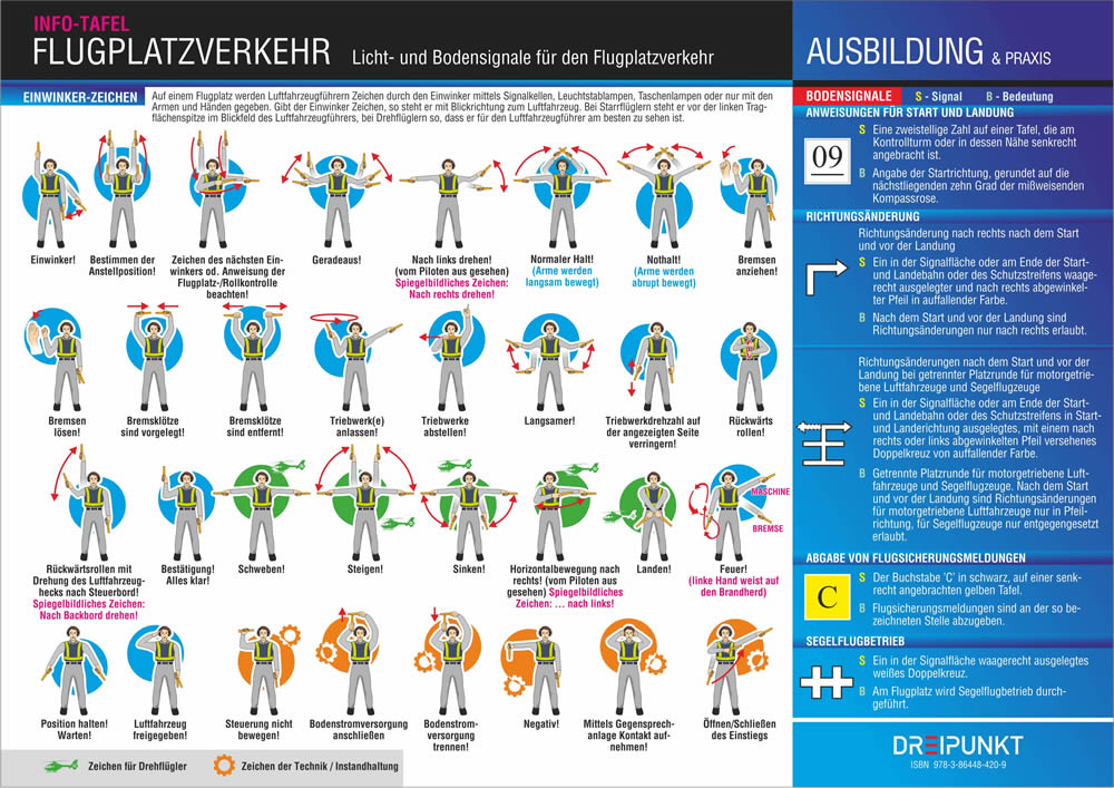 Diese Info-Tafel richtet sich an angehende Piloten und alle Luftfahrt-Interessierten, die wissen möchten, welche Informationen mit dem Einwinken und den Lichtsignalen übermittelt werden.