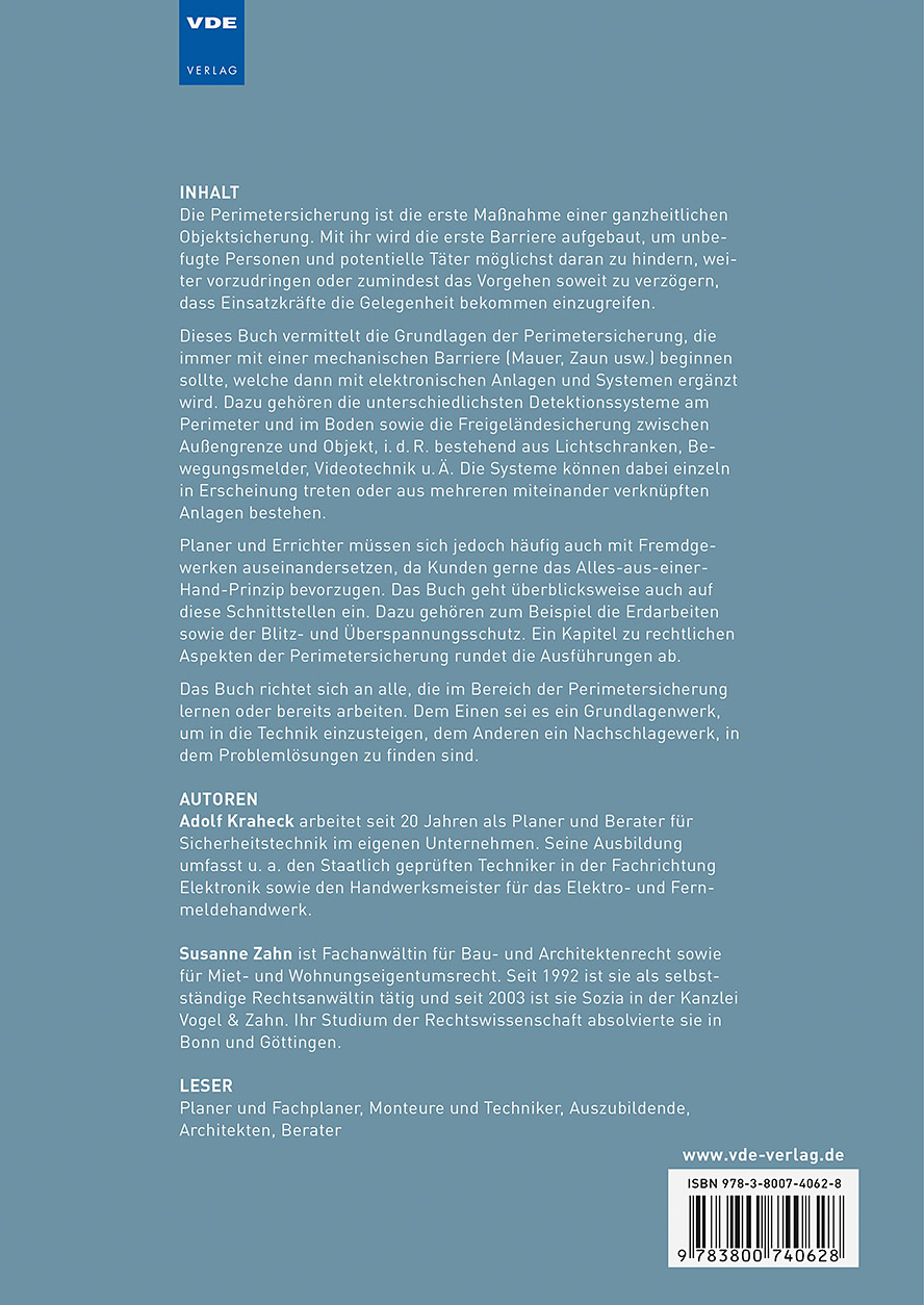 Adolf Kraheck arbeitete mehr als 20 Jahre als Planer und Berater für Sicherheitstechnik sowie als privater Sachverständiger für Sicherheitstechnik im eigenen Unternehmen. Seine Ausbildung umfasste den Staatlich geprüften Techniker in der Fachrichtung Elektronik sowie den Handwerksmeister für das Elektro- und Fernmeldehandwerk. Susanne Zahn ist Fachanwältin für Bau- und Architektenrecht sowie für Miet- und Wohnungseigentumsrecht. Seit 2003 ist sie Sozia in der Kanzlei Vogel & Zahn in Siegburg. Ihr Studium der Rechtswissenschaft absolvierte sie in Bonn und Göttingen.