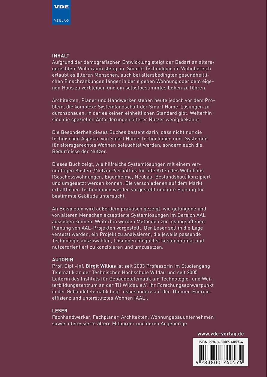 Aufgrund der demografischen Entwicklung steigt der Bedarf an altersgerechtem Wohnraum stetig an. Smarte Technologie im Wohnbereich erlaubt es älteren Menschen, auch bei altersbedingten gesundheitlichen Einschränkungen länger in der eigenen Wohnung oder dem eigenen Haus zu verbleiben und ein selbstbestimmtes Leben zu führen.Architekten, Planer und Handwerker stehen heute jedoch vor dem Problem, die komplexe Systemlandschaft der Smart Home-Lösungen zu durchschauen, in der es keinen einheitlichen Standard gibt. Weiterhin sind die speziellen Anforderungen älterer Nutzer wenig bekannt.Die Besonderheit dieses Buches besteht darin, dass nicht nur die technischen Aspekte von Smart Home-Technologien und -Systemen für altersgerechtes Wohnen beleuchtet werden, sondern auch die Bedürfnisse der Nutzer.Dieses Buch zeigt, wie hilfreiche Systemlösungen mit einem vernünftigen Kosten-/Nutzen-Verhältnis für alle Arten des Wohnbaus (Geschosswohnungen, Eigenheime, Neubau, Bestandsbau) konzipiert und umgesetzt werden können. Die verschiedenen auf dem Markt erhältlichen Technologien werden vorgestellt und ihre Eignung für bestimmte Gebäude untersucht.An Beispielen wird außerdem praktisch gezeigt, wie gelungene und von älteren Menschen akzeptierte Systemlösungen im Bereich AAL aussehen können. Weiterhin werden Methoden zur lösungsoffenen Planung von AAL-Projekten vorgestellt. Der Leser soll in die Lage versetzt werden, ein Projekt zu analysieren, die jeweils passende Technologie auszuwählen, Lösungen möglichst kostenoptimal und nutzerorientiert zu konzipieren und umzusetzen.