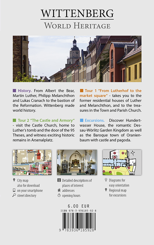 | Schlagworte | Architektur: Kirchen, Sakralbauten • City map • City Tours • Cranach • excursions • History • Luther • Melanchthon • Reformation • Regional Map • Straßenkarten und Stadtpläne • Unesco Welterbe • Wittenberg • Wittenberg; Reiseführer |