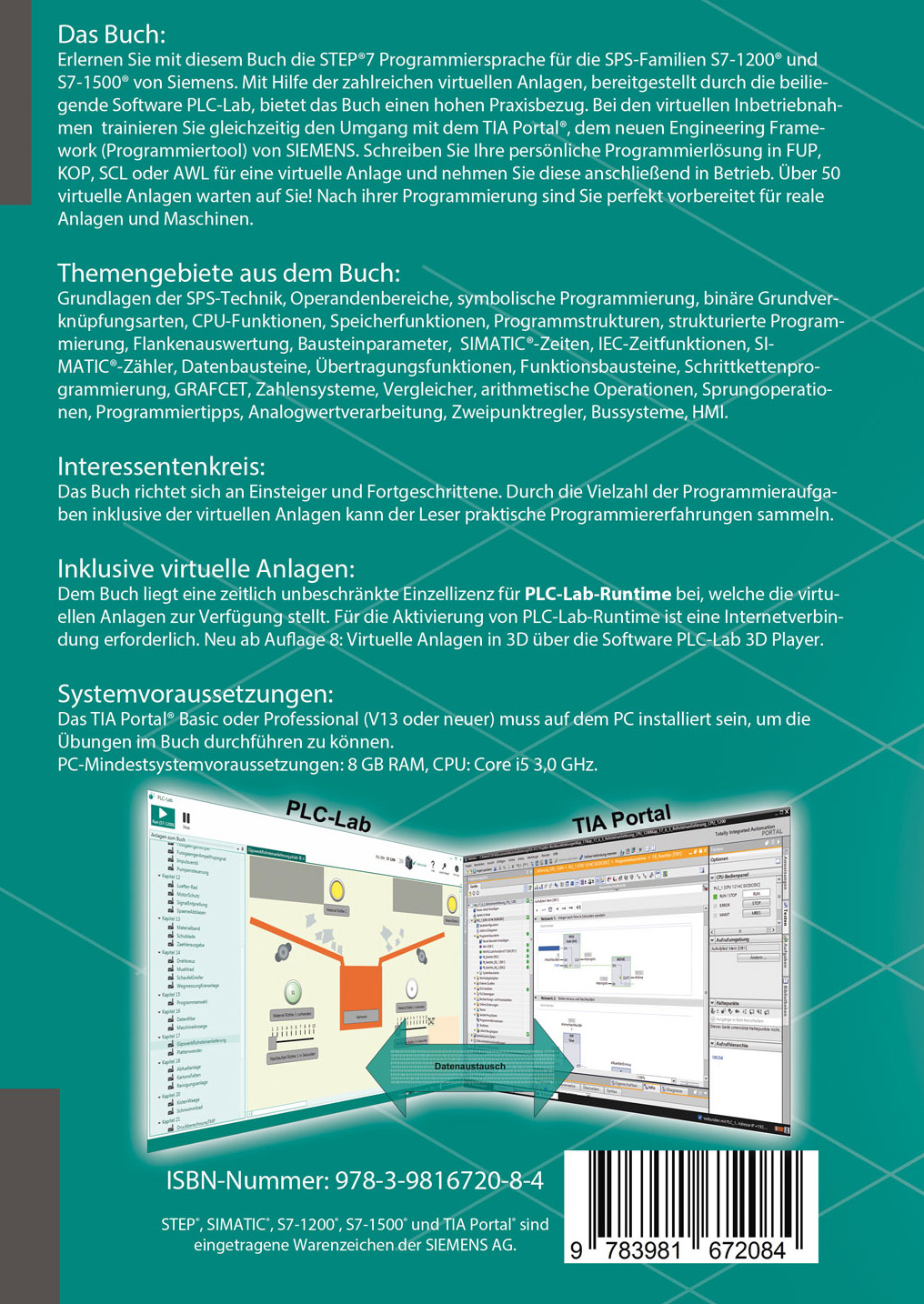 Erlernen Sie mit diesem Buch die STEP®7 Programmiersprache für die SPS-Familien S7-1200® und S7-1500® von Siemens. Mit Hilfe der zahlreichen virtuellen Anlagen, bereitgestellt durch die beiliegende Software PLC-Lab, bietet das Buch einen hohen Praxisbezug. Bei den virtuellen Inbetriebnahmen trainieren Sie gleichzeitig den Umgang mit dem TIA Portal®, dem neuen Engineering Framework (Programmiertool) von SIEMENS. Schreiben Sie Ihre persönliche Programmierlösung in FUP, KOP, SCL oder AWL für eine virtuelle Anlage und nehmen Sie diese anschließend in Betrieb. Über 50 virtuelle Anlagen warten auf Sie! Nach ihrer Programmierung sind Sie perfekt vorbereitet für reale Anlagen und Maschinen.