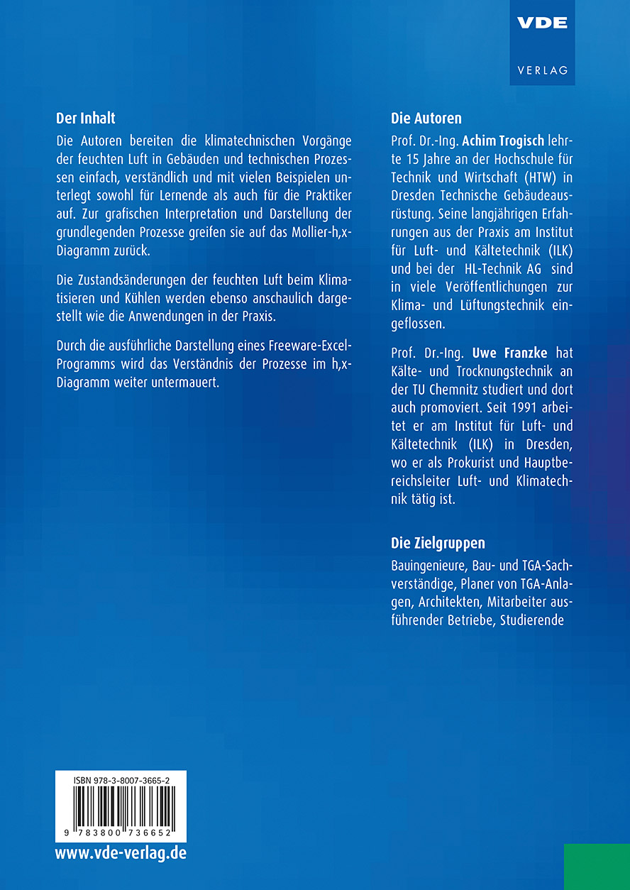 Prof. Dr.-Ing. Achim Trogisch lehrte 15 Jahre an der Hochschule für Technik und Wirtschaft (HTW) in Dresden Technische Gebäudeausrüstung. Seine langjährigen Erfahrungen aus der Praxis am Institut für Luft- und Kältetechnik (ILK) und bei der HL-Technik AG sind in viele Veröffentlichungen zur Klima- und Lüftungstechnik eingeflossen. Prof. Dr.-Ing. Uwe Franzke hat Kälte- und Trocknungstechnik an der TU Chemnitz studiert und dort auch promoviert. Seit 1991 arbeitet er am Institut für Luft- und Kältetechnik (ILK) in Dresden, wo er als Prokurist und Hauptbereichsleiter Luft- und Klimatechnik tätig ist.