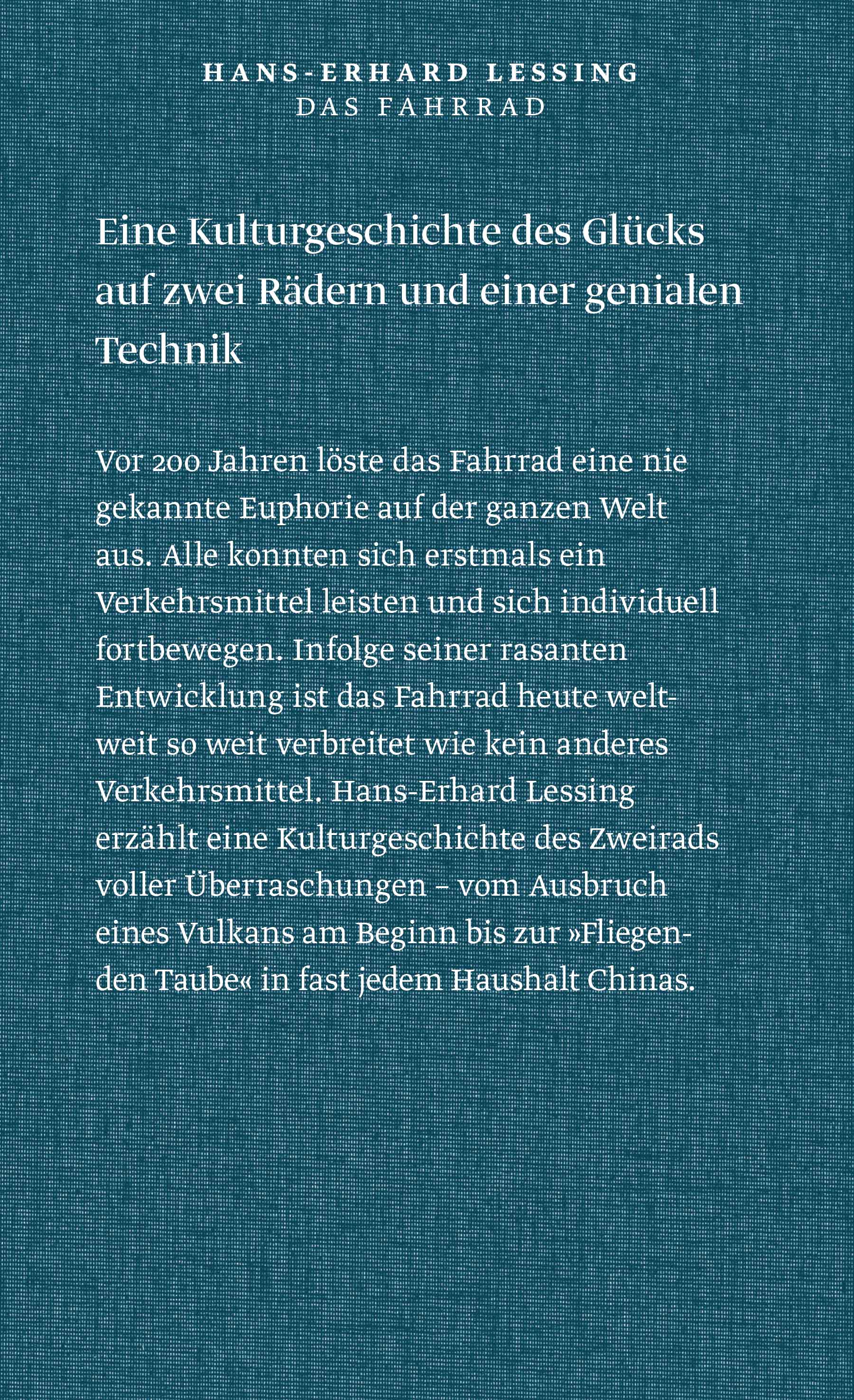 Hans-Erhard Lessing erläutert und erzählt, wie das Fahrrad vor 200 Jahren weltweit eine nie gekannte Euphorie auslöste. Zum ersten Mal konnten sich alle individuell bewegen und sich das »Glück auf zwei Rädern « leisten. Eine Kulturgeschichte des Zweirads voller Überraschungen - vom Ausbruch eines Vulkans am Beginn bis zur "Fliegenden Taube" in fast jedem Haushalt Chinas.