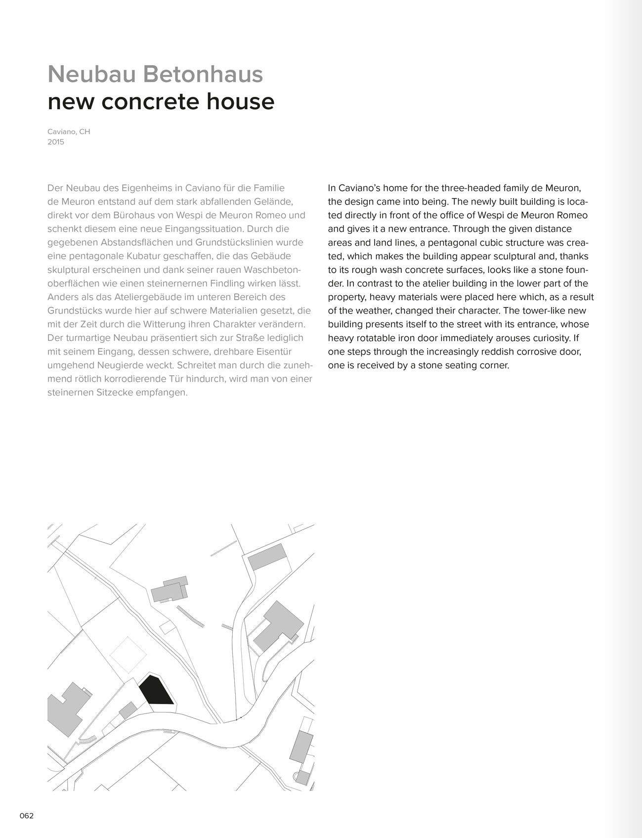 Die vielfach prämierten Schweizer Architekten Wespi de Meuron Romeo zeichnen sich durch einen außergewöhnlichen Umgang mit den Faktoren Material, Ort und Zeit aus. Bekannt geworden sind sie durch den Umbau einer Häusergruppe in ihrem Heimatdorf Caviano im Tessin, dessen charakteristische Steinmauern ihre Architektur nachhaltig prägen sollten. Kurz vor der Jahrtausendwende wurde das von Markus Wespi gegründete Büro am Coma-See durch Jerome de Meuron sowie 2012 durch den jungen Architekten Luca Romeo ergänzt und erarbeitet kunstvolle Wohnkonzepte mit elementarer Eigenwirkung.Durch den Einsatz der Komponenten Dach, Wand und Boden als spürbare Volumina kreieren sie eindrucksvolle Raumgefüge, in denen Ein-und Ausblicke zur Landschaft gezielt gesetzt werden. Eine zweite Schale bildet dabei einen Filter zur Umgebung und sorgt für einzigartige Lichtstimmungen. So entstehen Lebensräume, die die Themen Masse und Materialität in klaren Formen, skulpturalen Treppen und originären Baustoffen verhandeln und täglich erlebbar machen.