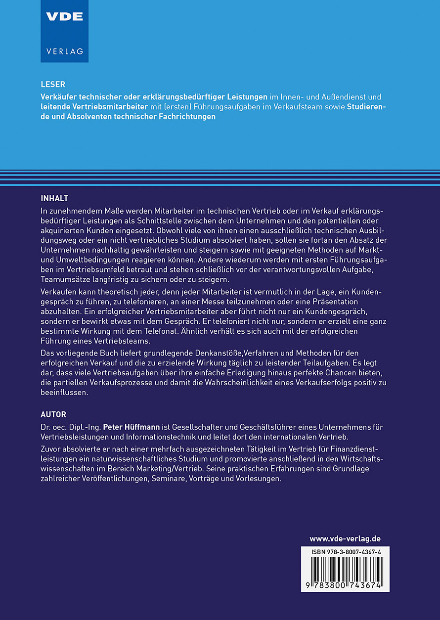 Dr. oec. Dipl.-Ing. Peter Hüffmann ist Gesellschafter und Geschäftsführer eines Unternehmens für Vertriebsleistungen und Informationstechnik und leitet dort den internationalen Vertrieb. Seine praktischen Erfahrungen als Verkäufer im Außendienst, als Vertriebsingenieur und schließlich als Vertriebsleiter, Senior Sales Director und Vertriebstrainer im internationalen Markt sind Grundlage zahlreicher Veröffentlichungen, Seminare und Vorträge.