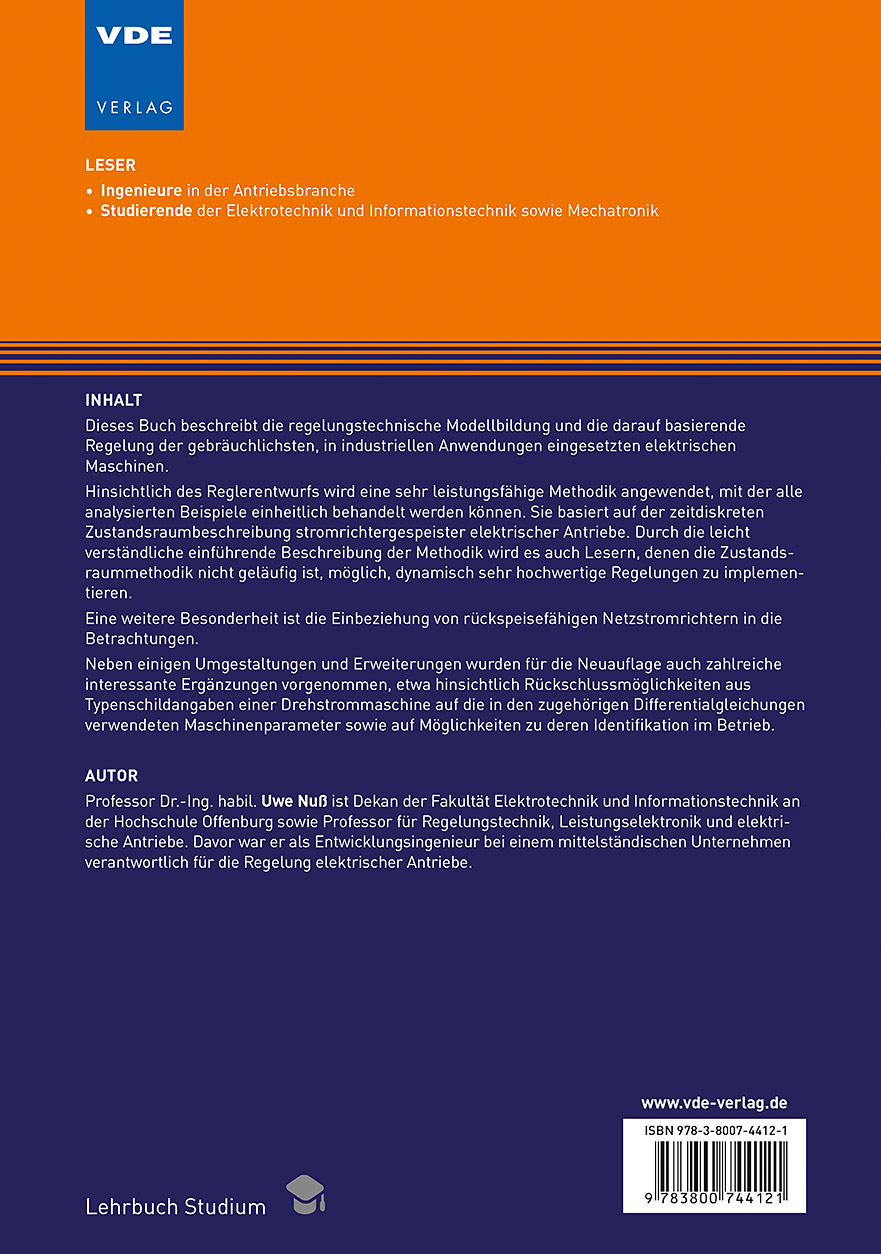 Dieses Buch beschreibt die regelungstechnische Modellbildung und die darauf basierende Regelung der gebräuchlichsten, in industriellen Anwendungen eingesetzten elektrischen Maschinen.Hinsichtlich des Reglerentwurfs wird eine sehr leistungsfähige Methodik angewendet, mit der alle analysierten Beispiele einheitlich behandelt werden können. Sie basiert auf der zeitdiskreten Zustandsraumbeschreibung stromrichtergespeister elektrischer Antriebe. Durch die leicht verständliche einführende Beschreibung der Methodik wird es auch Lesern, denen die Zustandsraummethodik nicht geläufig ist, möglich, dynamisch sehr hochwertige Regelungen zu implementieren.Eine weitere Besonderheit ist die Einbeziehung von rückspeisefähigen Netzstromrichtern in die Betrachtungen.Neben einigen Umgestaltungen und Erweiterungen wurden für die Neuauflage auch zahlreiche interessante Ergänzungen vorgenommen, etwa hinsichtlich Rückschlussmöglichkeiten aus Typenschildangaben einer Drehstrommaschine auf die in den zugehörigen Differentialgleichungen verwendeten Maschinenparameter sowie auf Möglichkeiten zu deren Identifikation im Betrieb.