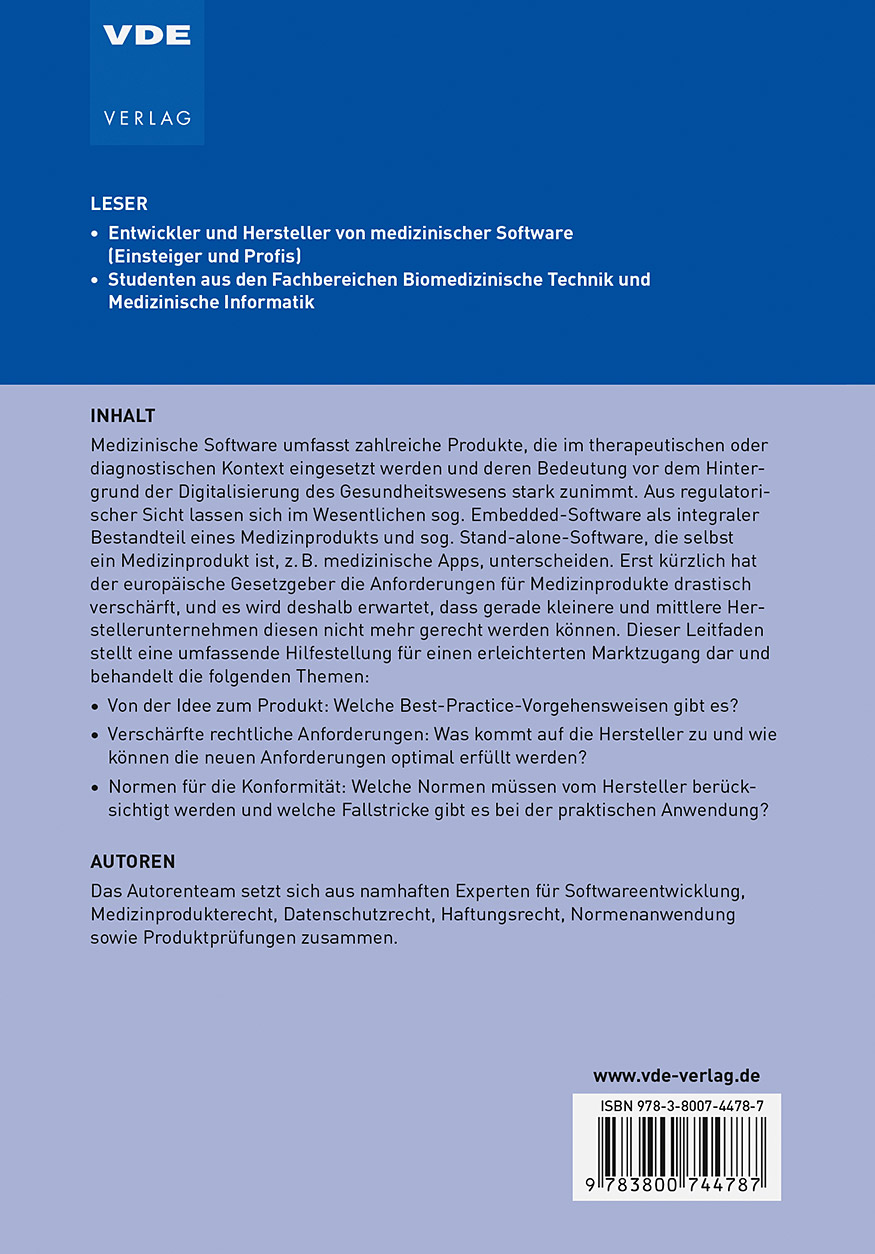 Medizinische Software umfasst zahlreiche Produkte, die im therapeutischen oder diagnostischen Kontext eingesetzt werden und deren Bedeutung vor dem Hintergrund der Digitalisierung des Gesundheitswesens stark zunimmt. Aus regulatorischer Sicht lassen sich im Wesentlichen sog. Embedded-Software als integraler Bestandteil eines Medizinprodukts und sog. Stand-alone-Software, die selbst ein Medizinprodukt ist, z. B. medizinische Apps, unterscheiden. Erst kürzlich hat der europäische Gesetzgeber die Anforderungen für Medizinprodukte drastisch verschärft, und es wird deshalb erwartet, dass gerade kleinere und mittlere Herstellerunternehmen diesen nicht mehr gerecht werden können. Dieser Leitfaden stellt eine umfassende Hilfestellung für einen erleichterten Marktzugang dar und behandelt die folgenden Themen:- Von der Idee zum Produkt: Welche Best-Practice-Vorgehensweisen gibt es?- Verschärfte rechtliche Anforderungen: Was kommt auf die Hersteller zu und wie können die neuen Anforderungen optimal erfüllt werden?- Normen für die Konformität: Welche Normen müssen vom Hersteller berücksichtigt werden und welche Fallstricke gibt es bei der praktischen Anwendung?