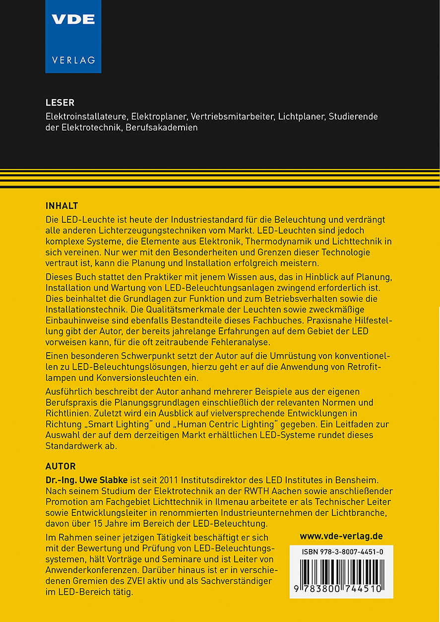 Die LED-Leuchte ist heute der Industriestandard für die Beleuchtung und verdrängt zunehmend alle anderen Lichterzeugungstechniken vom Markt. LED-Leuchten sind jedoch komplexe Systeme, die Elemente aus Elektronik, Thermodynamik und Lichttechnik in sich vereinen. Nur wer mit den Besonderheiten und Grenzen dieser Technologie vertraut ist, kann die Planung und Installation erfolgreich meistern.Dieses Buch stattet den Praktiker mit jenem Wissen aus, das in Hinblick auf Planung, Installation und Wartung von LED-Beleuchtungsanlagen zwingend erforderlich ist. Dies beinhaltet die Grundlagen zur Funktion und zum Betriebsverhalten sowie die Installationstechnik. Die Qualitätsmerkmale der Leuchten sowie zweckmäßige Einbauhinweise sind ebenfalls Bestandteile dieses Fachbuches. Praxisnahe Hilfestellung gibt der Autor, der bereits jahrelange Erfahrungen auf dem Gebiet der LED vorweisen kann, für die oft zeitraubende Fehleranalyse.Einen besonderen Schwerpunkt setzt der Autor auf die Umrüstung von konventionellen zu LED-Beleuchtungslösungen, hierzu geht er auf die Anwendung von Retrofitlampen und Konversionsleuchten ein.Ausführlich beschreibt der Autor anhand mehrerer Beispiele aus der eigenen Berufspraxis die Planungsgrundlagen einschließlich der relevanten Normen und Richtlinien. Zuletzt wird ein Ausblick auf vielversprechende Entwicklungen in Richtung "Smart Lighting" und "Human Centric Lighting" gegeben. Ein Leitfaden zur Auswahl der auf dem derzeitigen Markt erhältlichen LED-Systeme rundet dieses Standardwerk ab.