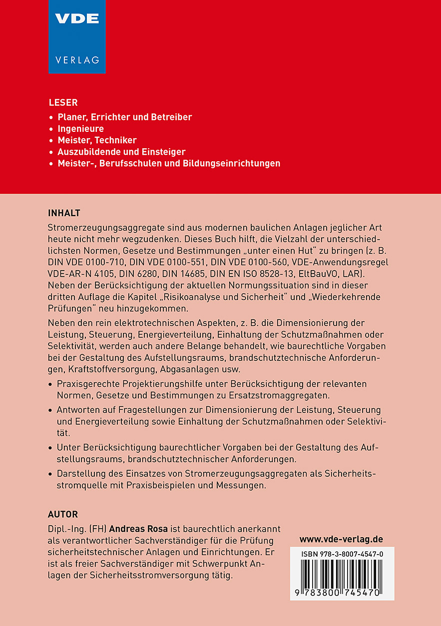 Stromerzeugungsaggregate sind aus modernen baulichen Anlagen jeglicher Art heute nicht mehr wegzudenken. Dieses Buch hilft, die Vielzahl der unterschiedlichsten Normen, Gesetze und Bestimmungen "unter einen Hut" zu bringen (z. B. DIN VDE 0100-710, DIN VDE 0100-551, DIN VDE 0100-560, VDE-Anwendungsregel VDE-AR-N 4105, DIN 6280, DIN 14685, DIN EN ISO 8528-13, EltBauVO, LAR).Neben der Berücksichtigung der aktuellen Normungssituation sind in dieserdritten Auflage die Kapitel "Risikoanalyse und Sicherheit" und "Wiederkehrende Prüfungen" neu hinzugekommen.Neben den rein elektrotechnischen Aspekten, z. B. die Dimensionierung der Leistung, Steuerung, Energieverteilung, Einhaltung der Schutzmaßnahmen oder Selektivität, werden auch andere Belange behandelt, wie baurechtliche Vorgaben bei der Gestaltung des Aufstellungsraums, brandschutztechnische Anforderungen, Kraftstoffversorgung, Abgasanlagen usw.Praxisgerechte Projektierungshilfe unter Berücksichtigung der relevanten Normen, Gesetze und Bestimmungen zu Ersatzstromaggregaten. Antworten auf Fragestellungen zur Dimensionierung der Leistung, Steuerung und Energieverteilung sowie Einhaltung der Schutzmaßnahmen oder Selektivität. Unter Berücksichtigung baurechtlicher Vorgaben bei der Gestaltung des Aufstellungsraums, brandschutztechnischer Anforderungen. Darstellung des Einsatzes von Stromerzeugungsaggregaten als Sicherheitsstromquelle mit Praxisbeispielen und Messungen.
