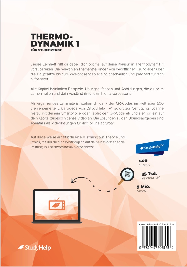 Als ergänzendes Lernmaterial stehen dir durch QR-Codes im Heft über 500 themenbasierte Erklärvideos von „StudyHelp TV“ zur Verfügung. Scanne hierzu mit deinem Smartphone oder Tablet den QR-Code ab und sieh dir ein auf dein Kapitel zugeschnittenes Video an. So erhältst du eine Mischung aus Theorie und Praxis, mit der du bestmöglich auf deine bevorstehende Prüfung in Thermodynamik 1 vorbereitet bist.