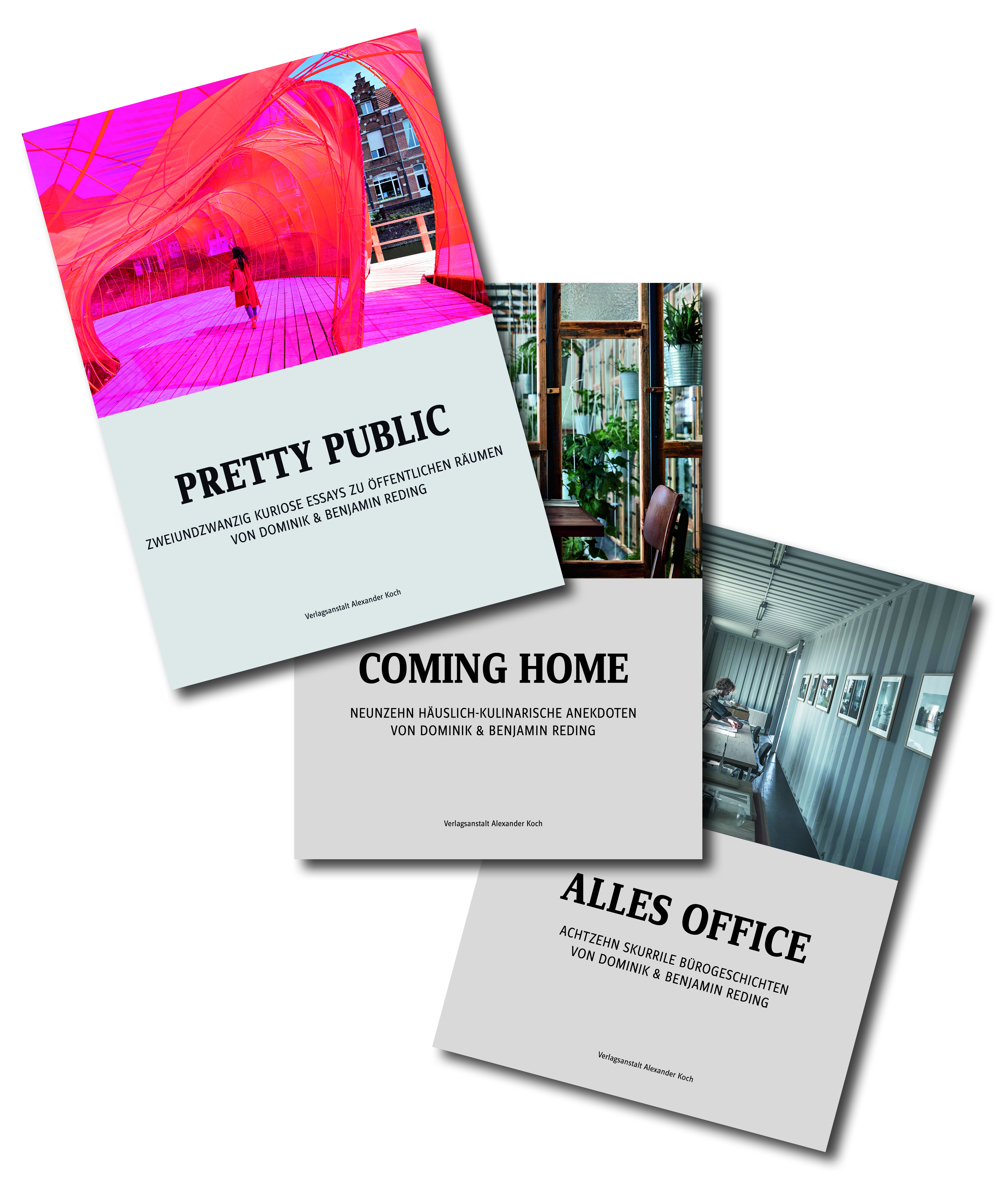 Kolumnisten - und so bittet die Architekturfachzeitschrift AIT seit 2010 die Berliner Filme macher Dominik und Benjamin Reding allmonatlich um einen kurzweiligen, literarischen Einstieg in das jeweilige Heftthema. Wer Drehbücher schreiben kann, dem gelingen offensichtlich auch Kolumnen, und so beglücken die Zwillingsbrüder die Leser der AIT mit Geschichten, die skurriler und spannender nicht erzählt sein könnten. Die drei Bücher "Alles Office" "Coming Home" und "Pretty Public", erschienen in den Jahren 2016, 2017 und 2018, versammeln insgesamt 59 ihrer schönsten Geschichten.