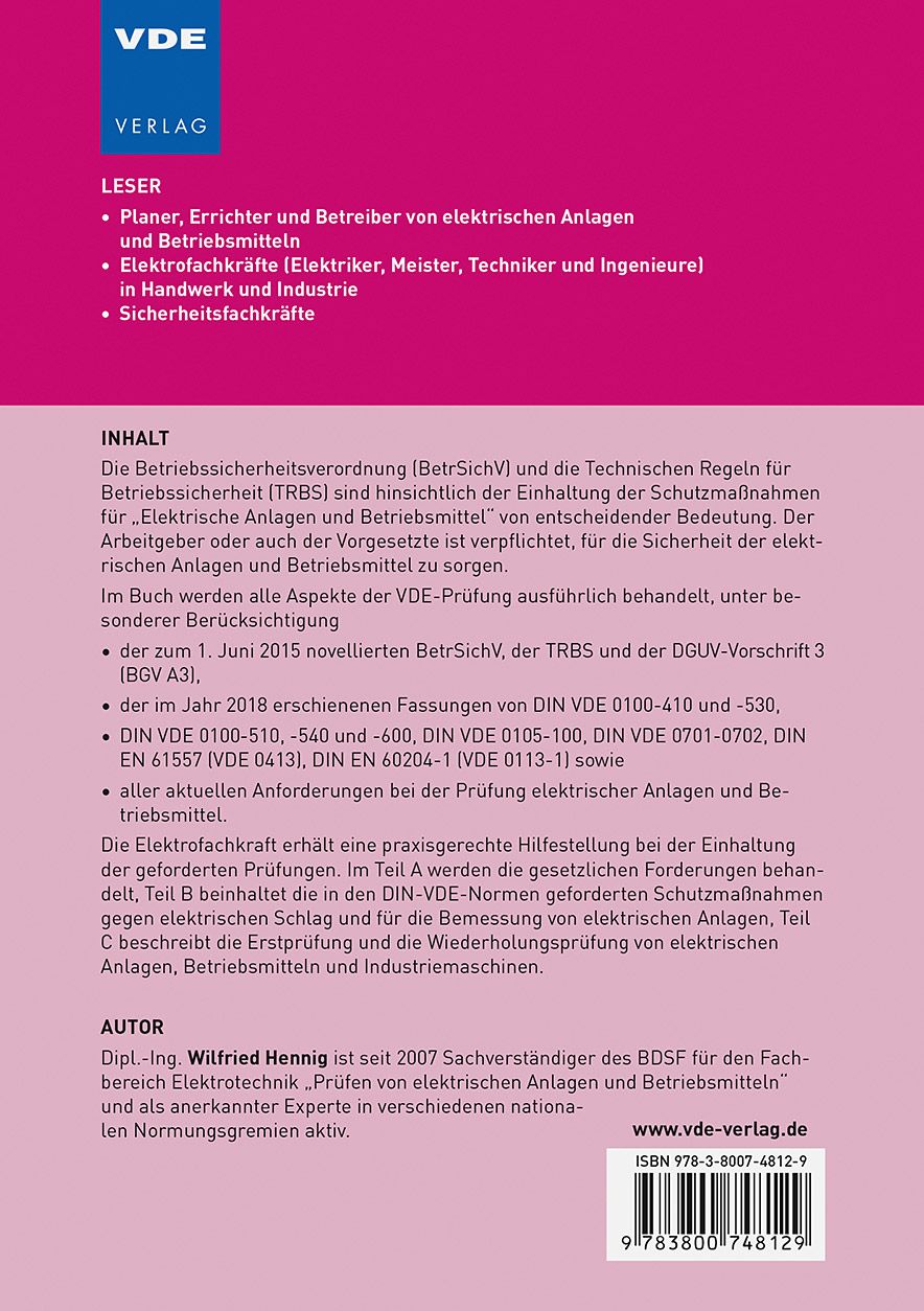 Erläuterungen zu DIN VDE 0100-410, DIN VDE 0100-430, DIN VDE 0100-510, DIN VDE 0100-540 und DIN VDE 0100-600, DIN VDE 0105-100/A1, DIN VDE 0701-0702, DIN EN 61557 (VDE 0413), DIN EN 60204-1 (VDE 0113-1), TRBS 1001, TRBS 1111, TRBS 1201, TRBS 1203, DGUV-Vorschrift 3 (BGV A3) sowie zur Betrie