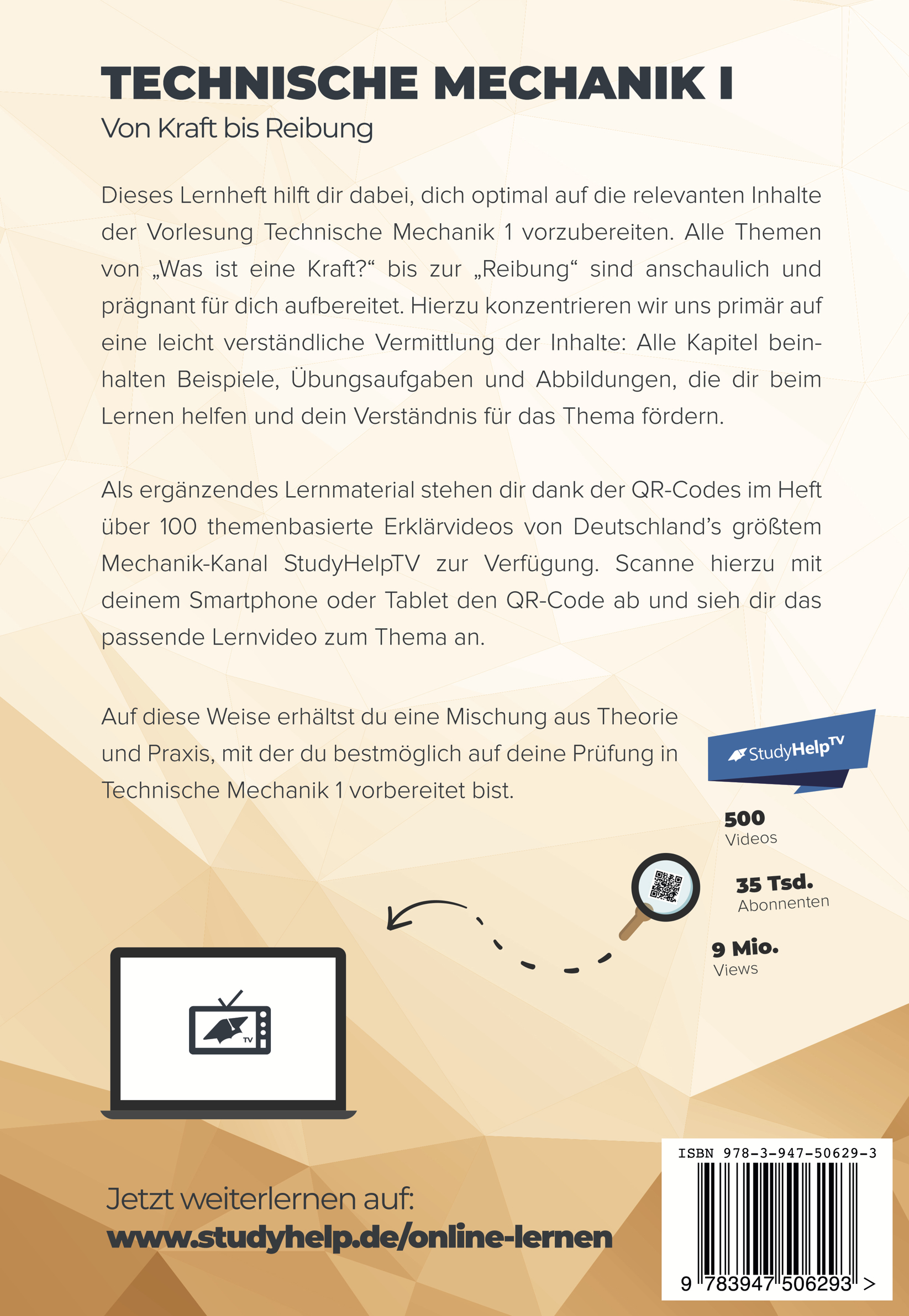 Als ergänzendes Lernmaterial stehen dir dank der QR-Codes im Heft über 500 themenbasierte Erklärvideos von „StudyHelp TV“ zur Verfügung. Scanne hierzu mit deinem Smartphone oder Tablet den QR-Code ab und sieh dir ein auf dein Kapitel zugeschnittenes Video an. So erhältst du eine Mischung aus Theorie und Praxis, mit der du bestmöglich auf deine bevorstehende Prüfung in Technischer Mechanik 1 vorbereitet bist.