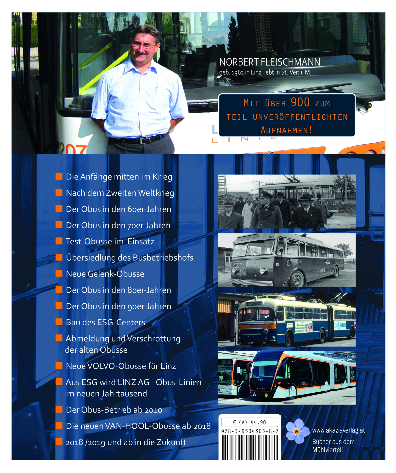 Zum Jubliäum 75 Jahre Obus in Linz bringt Norbert Fleischmann einen großangelegten Band über die Geschichte des öffentlichen Transportmittels heraus. Über 900 Fotos und Abbildungen dokumentieren die Entwicklung des Obus im Lauf der Zeit. Die einzelnen Bustypen werden vorgestellt. Schaltpläne, Streckenpläne und Fahrpläne ergänzen den umfangreichen Band.