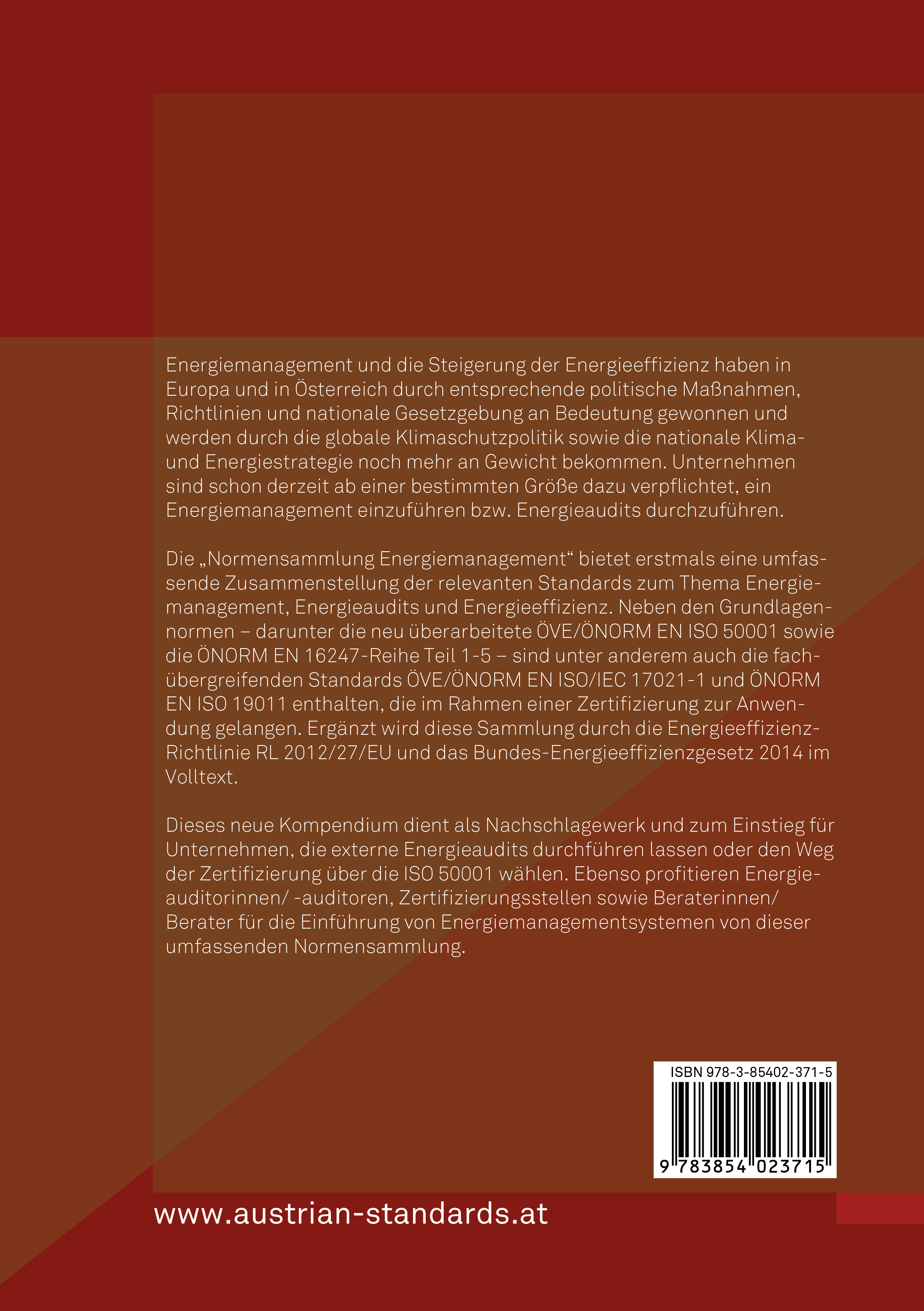 ÖVE/ÖNORM EN ISO 50001 sowie die ÖNORM EN 16247-Reihe Teil 1-5 – sind unter anderem auch die fachübergreifenden Standards ÖVE/ÖNORM EN ISO/IEC 17021-1 und ÖNORM EN ISO 19011 enthalten, die im Rahmen einer Zertifizierung zur Anwendung gelangen. Ergänzt wird diese Sammlung durch die Energieeffizienz-Richtlinie RL 2012/27/EU und das Bundes-Energieeffizienzgesetz 2014 im Volltext.