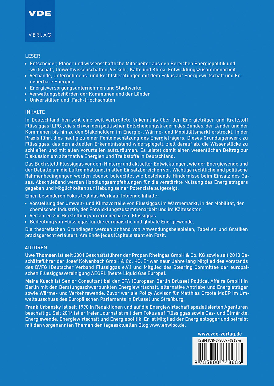 Uwe Thomsen studierte Betriebswirtschaftslehre an der Hochschule Bremen. Seit 2001 ist er Geschäftsführer der Propan Rheingas GmbH & Co. KG und seit 2010 Geschäftsführer der Josef Kolvenbach GmbH & Co. KG. Er war neun Jahre Mitglied des Vorstandes des DVFG (Deutscher Verband Flüssiggas e.V.) und Mitglied des Steering Committee der AEGPL (heute Liquid Gas Europe). Maira Kusch absolvierte ein Masterstudium der Internationalen Studien / Friedens- und Konfliktforschung an der Johann Wolfgang Goethe-Universität Frankfurt am Main sowie der Technischen Universität Darmstadt. Sie arbeitet seit 2017 als Senior Consultant bei der EPA (European Berlin Brüssel Political Affairs GmbH) in Berlin. Zuvor war sie Policy Advisor für Matthias Groote MdEP im Umweltausschuss des Europäischen Parlaments in Brüssel und Straßburg. Frank Urbansky absolvierte ein Studium der Journalistik an der Universität Leipzig. Seit 2014 ist er freier Journalist und Fachautor für zahlreiche Verlage in Deutschland mit den Schwerpunkten Flüssiggas sowie Gas- und Ölmärkte, Energiewende, Energiewirtschaft und Energiepolitik. Er ist Mitglied der Energieblogger und betreibt mit den vorgenannten Themen den tagesaktuellen Blog www.enwipo.de.