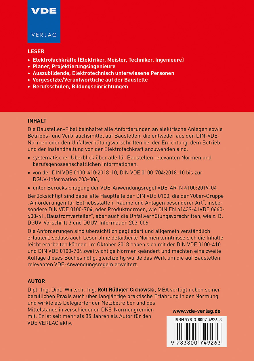 Dipl.-Ing. Dipl.-Wirtsch.-Ing. Rolf Rüdiger Cichowski, MBA verfügt neben seinen beruflichen Erfahrungen über langjährige praktische Erfahrung in der Normung und wirkte als Delegierter der Netzbetreiber und des Mittelstands in verschiedenen DKE-Normengremien mit und ist seit mehr als 35 Jahren als Autor für den VDE VERLAG aktiv.