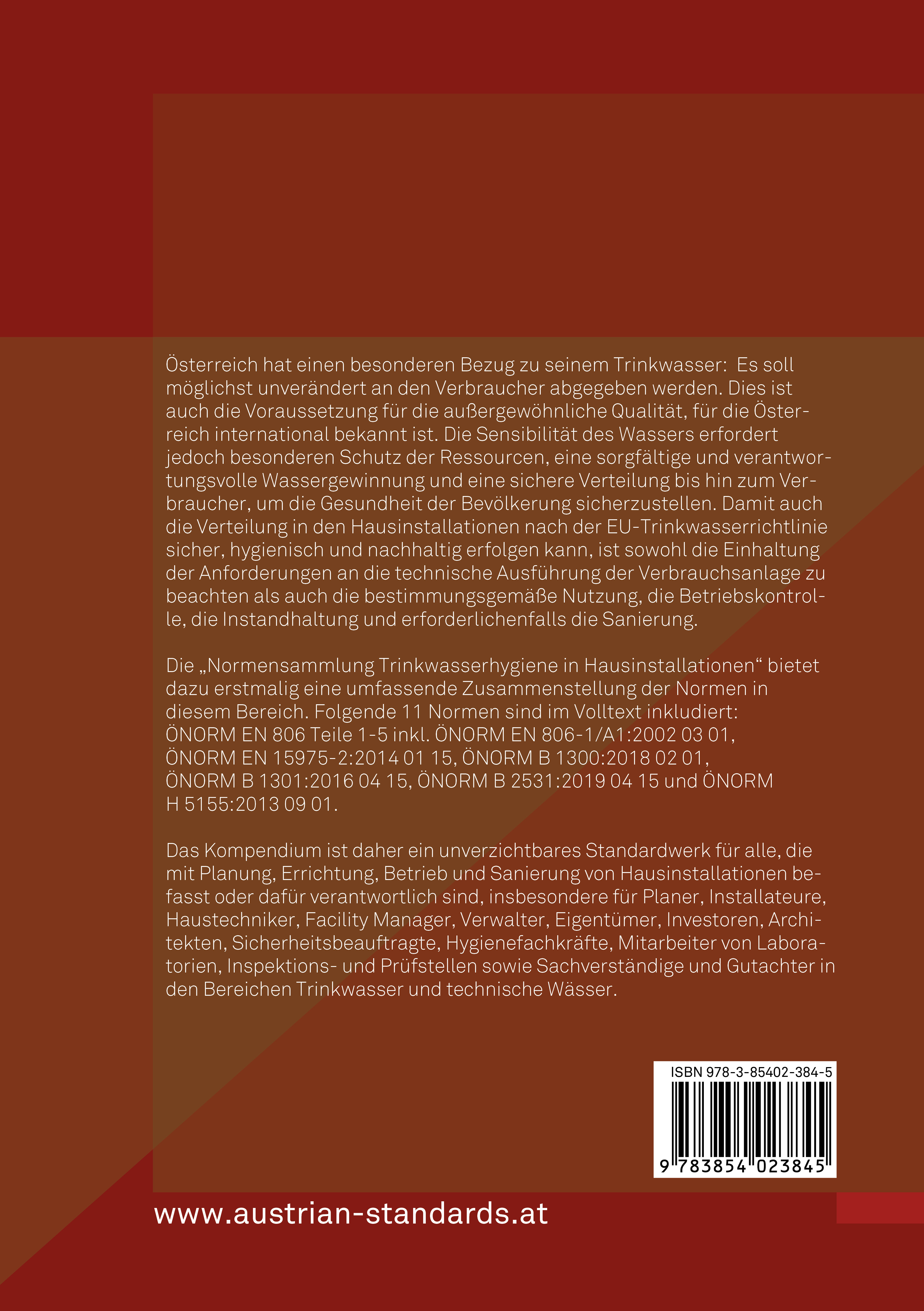 Die "Normensammlung Trinkwasserhygiene in Hausinstallationen" bietet dazu erstmalig eine umfassende Zusammenstellung der Normen in diesem Bereich. Folgende 11 Normen sind im Volltext inkludiert: ÖNORM EN 806 Teile 1-5 inkl. ÖNORM EN 806-1/A1:2002 03 01, ÖNORM EN 15975-2:2014 01 15, ÖNORM B 1300:2018 02 01, ÖNORM B 1301:2016 04 15, ÖNORM B 2531:2019 04 15 und ÖNORM H 5155:2013 09 01.
