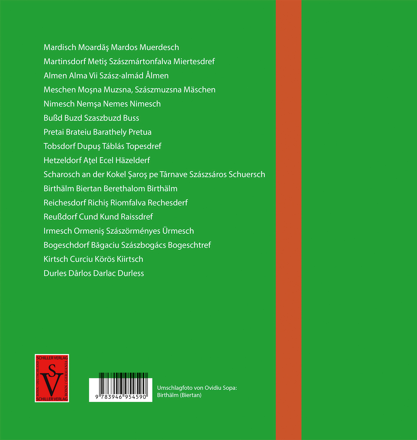 Mardisch Moardas Mardos Muerdesch Martinsdorf Metis Szászmártonfalva Miertesdref Almen Alma Vii Szászalmád Ålmen Meschen Mosna Muzsna, Szászmuzsna Mäschen Nimesch Nemsa Nemes Nimesch Bußd Buzd Szászbuzd Buss Pretai Brateiu Baráthely Pretua Tobsdorf Dupus Táblás Topesdref Hetzeldorf Atel Ecel Häzelderf Scharosch an der Kokel Saros pe Târnave Szászsáros Schuersch Birthälm Biertan Berethalom Birthälm Reichesdorf Richis Riomfalva Rechesderf Reußdorf Cund Kund Raissdref Irmesch Ormenis Szászörményes Ürmesch Bogeschdorf Bagaciu Szászbogács Bogeschtref Kirtsch Curciu Körös Kiirtsch Durles Dârlos Darlac DurlessNirgendwo sonst in Siebenbürgen stehen die Kirchenburgen so dicht an dicht wie zwischen Mediasch und Schäßburg. Zwei Bände sind notwendig, um all diese Kleinode standesgemäß unterzubringen. Nun liegt der erste vor, der Titel »Mittleres Kokelland« meint die Region zwischen Mediasch im Westen und der Straße DJ147 im Norden. Im Osten ist die Grenze die Linie Elisabethstadt/Dumbraveni nach Norden bis Groß lasseln/Laslau Mare, und im Süden schließlich die schräg aufsteigende Linie vom Kaltwassertal bis Birthälm.