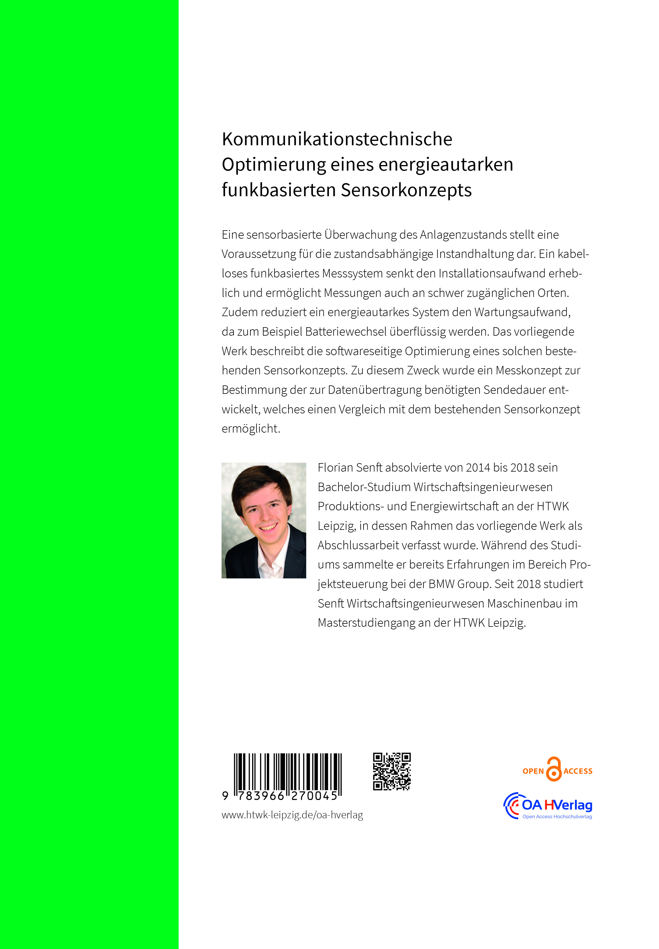 Eine sensorbasierte Überwachung des Anlagenzustands stellt eine Voraussetzung für die zustandsabhängige Instandhaltung dar. Ein kabelloses funkbasiertes Messsystem senkt den Installationsaufwand erheblich und ermöglicht Messungen auch an schwer zugänglichen Orten. Zudem reduziert ein energieautarkes System den Wartungsaufwand, da zum Beispiel Batteriewechsel überflüssig werden. Das vorliegende Werk beschreibt die softwareseitige Optimierung eines solchen bestehenden Sensorkonzepts. Zu diesem Zweck wurde ein Messkonzept zur Bestimmung der zur Datenübertragung benötigten Sendedauer entwickelt, welches einen Vergleich mit dem bestehenden Sensorkonzept ermöglicht.