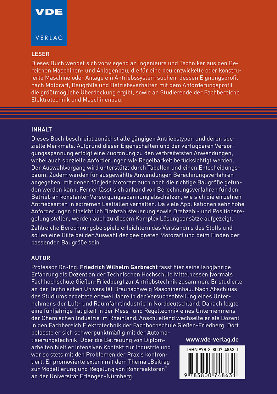 Prof. Dr.-Ing. Friedrich Wilhelm Garbrecht fasst hier seine langjährige Erfahrung als Dozent an der Technischen Hochschule Mittelhessen (vormals Fachhochschule Gießen-Friedberg) zu Elektromotoren zusammen. Weitere Schwerpunkte seiner Tätigkeit waren Regelungstechnik und Elektronik.