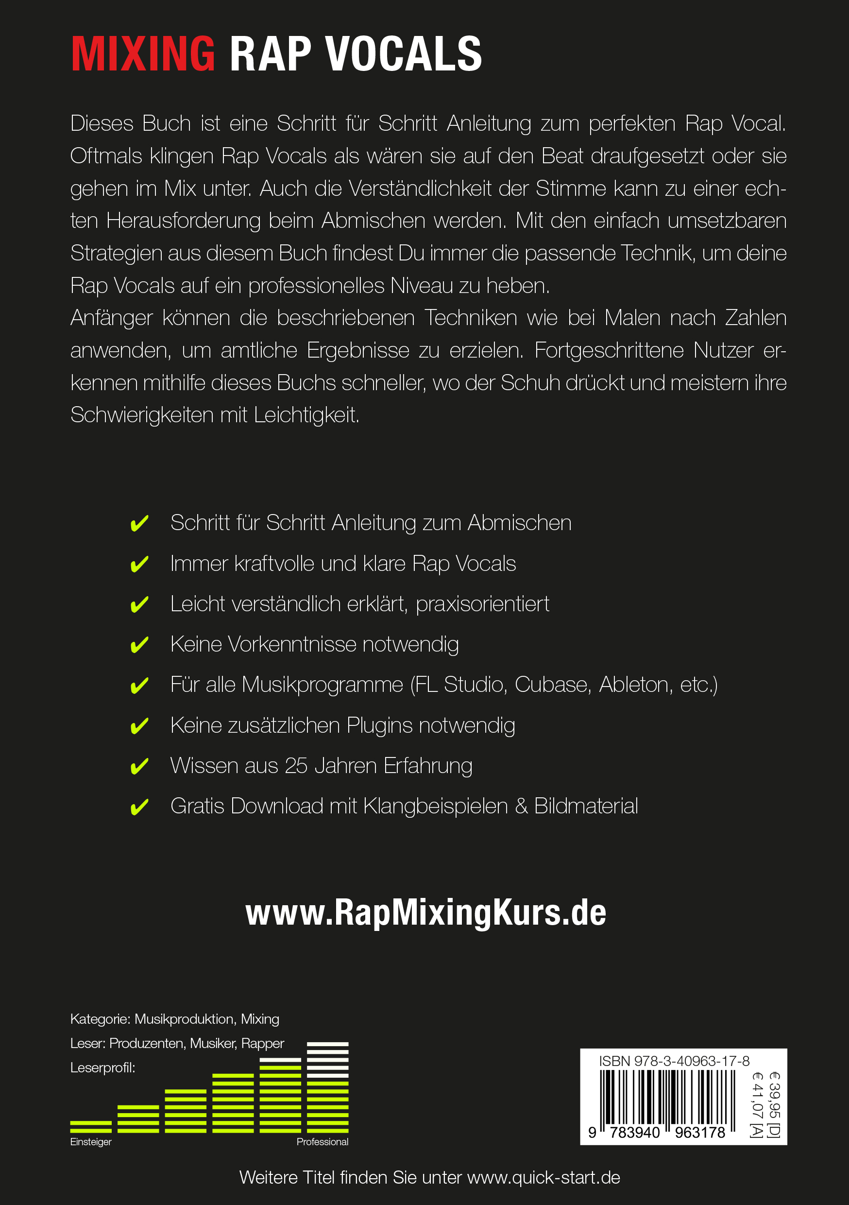 Oftmals klingen Rap Vocals als wären sie auf den Beat draufgesetzt oder sie gehen im Mix unter. Auch die Verständlichkeit der Stimme kann zu einer echten Herausforderung beim Abmischen werden. Mit den einfach umsetzbaren Strategien aus diesem Buch findest Du immer die passende Technik, um deine Rap Vocals auf ein professionelles Niveau zu heben.