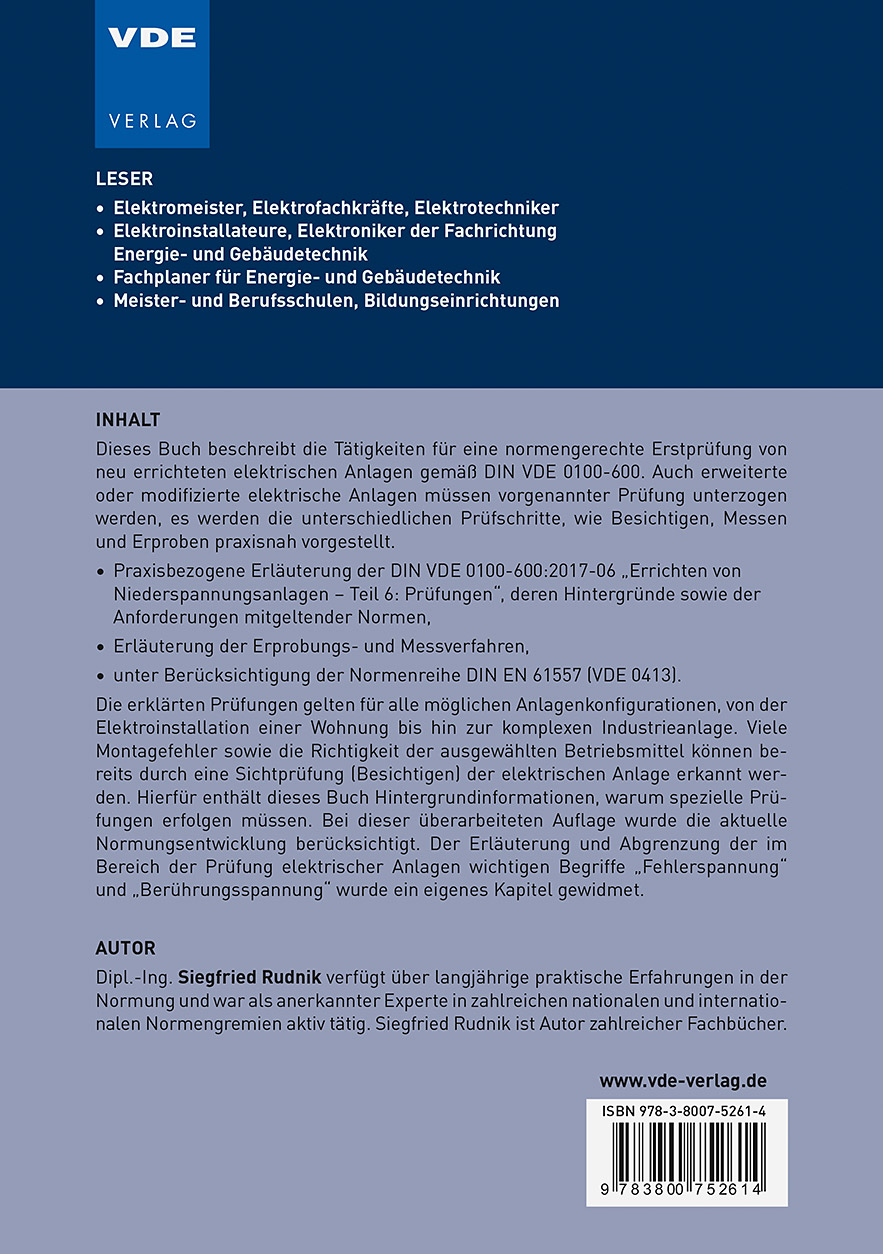 Dieses Buch beschreibt die Tätigkeiten für eine normengerechte Erstprüfung von neu errichteten elektrischen Anlagen gemäß DIN VDE 0100-600. Auch erweiterte oder modifizierte elektrische Anlagen müssen vorgenannter Prüfung unterzogen werden, es werden die unterschiedlichen Prüfschritte, wie Besichtigen, Messen und Erproben praxisnah vorgestellt.- Praxisbezogene Erläuterung der DIN VDE 0100-600:2017-06 "Errichten von Niederspannungsanlagen - Teil 6: Prüfungen", deren Hintergründe sowie der Anforderungen mitgeltender Normen,- Erläuterung der Erprobungs- und Messverfahren,- unter Berücksichtigung der Normenreihe DIN EN 61557 (VDE 0413).Die erklärten Prüfungen gelten für alle möglichen Anlagenkonfigurationen, von derElektroinstallation einer Wohnung bis hin zur komplexen Industrieanlage. Viele Montagefehler sowie die Richtigkeit der ausgewählten Betriebsmittel können bereits durch eine Sichtprüfung (Besichtigen) der elektrischen Anlage erkannt werden. Hierfür enthält dieses Buch Hintergrundinformationen, warum spezielle Prüfungen erfolgen müssen. Bei dieser überarbeiteten Auflage wurde die aktuelle Normungsentwicklung berücksichtigt. Der Erläuterung und Abgrenzung der im Bereich der Prüfung elektrischer Anlagen wichtigen Begriffe "Fehlerspannung" und "Berührungsspannung" wurde ein eigenes Kapitel gewidmet.