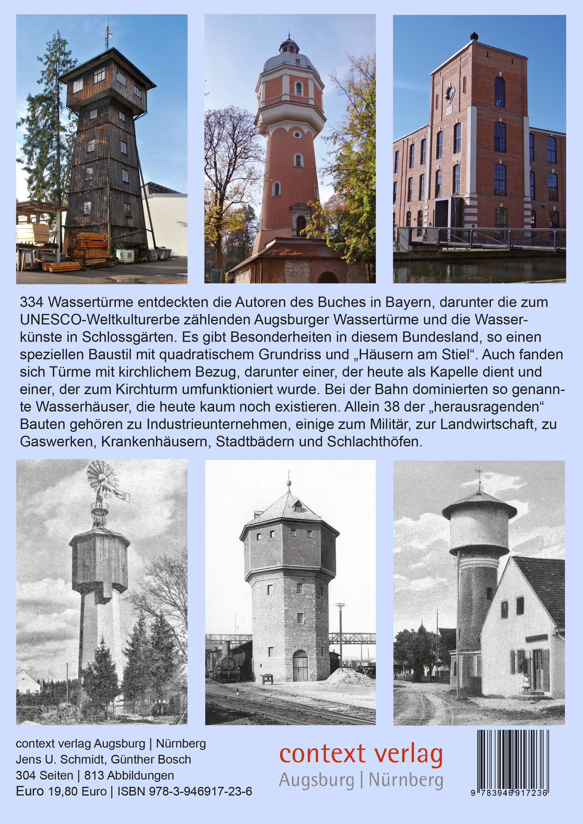 334 Wassertürme entdeckten die Autoren des Buches in Bayern, darunter die zum UNESCO-Weltkulturerbe zählenden Augsburger Wassertürme und die Wasserkünste in Schlossgärten. Es gibt Besonderheiten in diesem Bundesland, so einen speziellen Baustil mit quadratischem Grundriss und "Häusern am Stiel". Auch fanden sich Türme mit kirchlichem Bezug, darunter einer, der heute als Kapelle dient und einer, der zum Kirchturm umfunktioniert wurde. Bei der Bahn dominierten so genannte Wasserhäuser, die heute kaum noch existieren. Allein 38 der "herausragenden" Bauten gehören zu Industrieunternehmen, einige zum Militär, zur Landwirtschaft, zu Gaswerken, Krankenhäusern, Stadtbädern und Schlachthöfen.