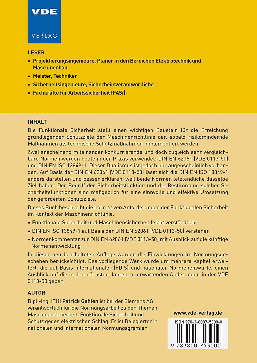 | Schlagworte | CE-Kennzeichnung • DIN EN 62061 (VDE 0113-50) • DIN EN ISO 13849-1 • Funktionale Sicherheit • Haftung • Maschinensicherheit • Performance Level (PL) • Risikobeurteilung • Sicherheitsintegritätslevel (S • Sicherheit von Maschinen |