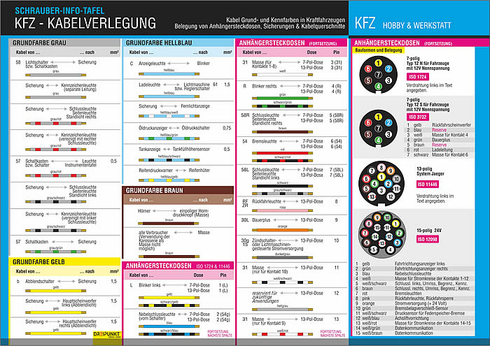 Kabel: Grund- und Kennfarben in Kraftfahrzeugen. Belegung von Anhängersteckdosen, Sicherungen & Kabelquerschnitte.