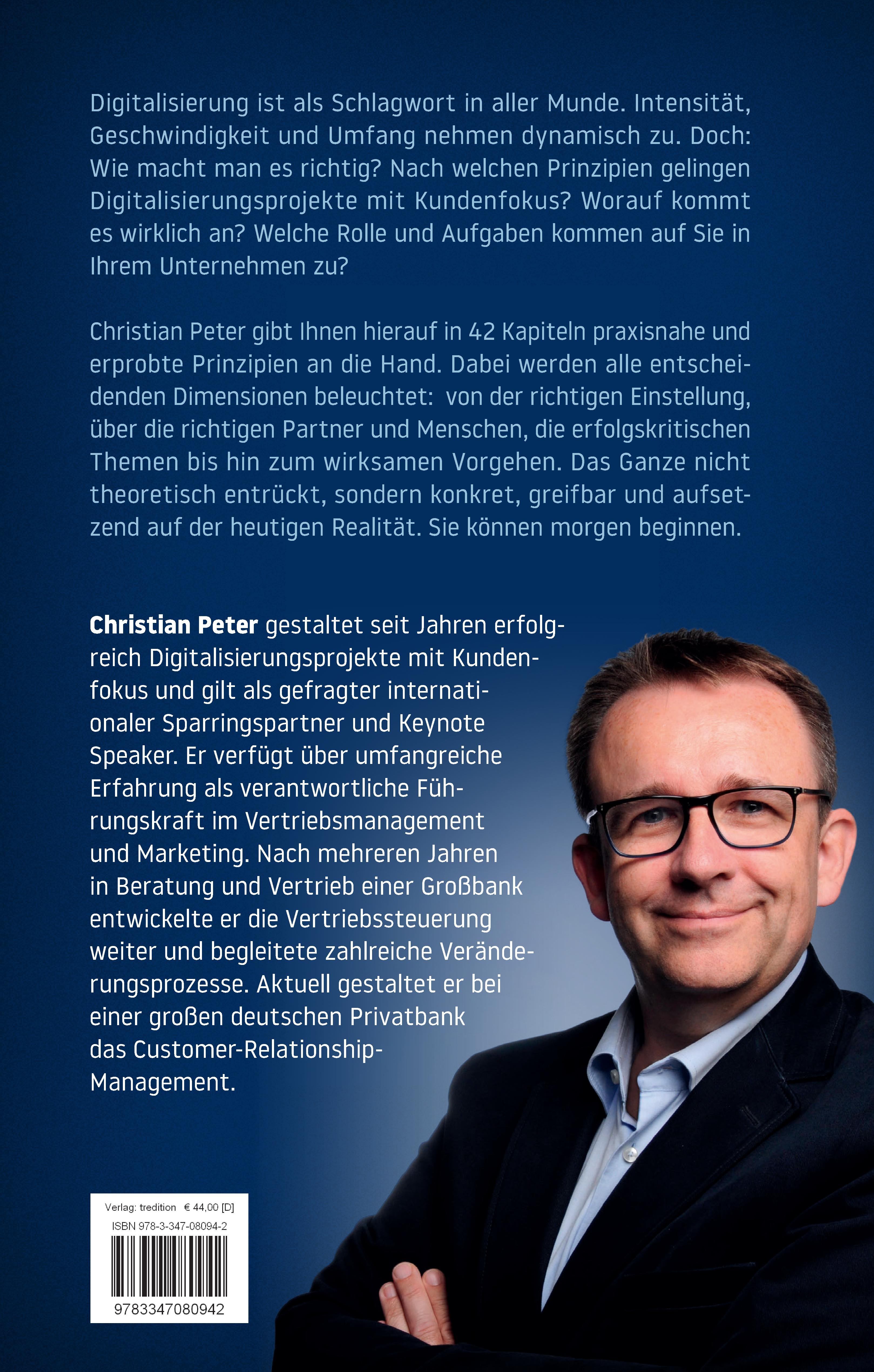 Christian Peter, geboren 1969 in Wiesbaden, gestaltet seit Jahren erfolgreich Digitalisierungsprojekte und gilt international als gefragter Sparringspartner und Key-Note-Speaker zu Digitalisierungsvorhaben mit Kundenfokus. Er verfügt über umfangreiche Erfahrung als verantwortliche Führungskraft im Vertriebsmanagement und Marketing. Nach mehreren Jahren in Beratung & Vertrieb einer Großbank entwickelte er die Vertriebssteuerung weiter und begleitete zahlreiche Veränderungsprozesse. Sein Fokus liegt in Digitalisierungsprojekten mit konsequenter Kundenzentrierung. Aktuell gestaltet er bei einer großen deutschen Privatbank das Customer-Relationship-Management. Sein Ziel ist es, Mensch und Maschine zu Partnern zu machen.